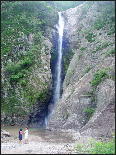 예저수 못(옥계폭포 위)에서 내려다 본 폭포
