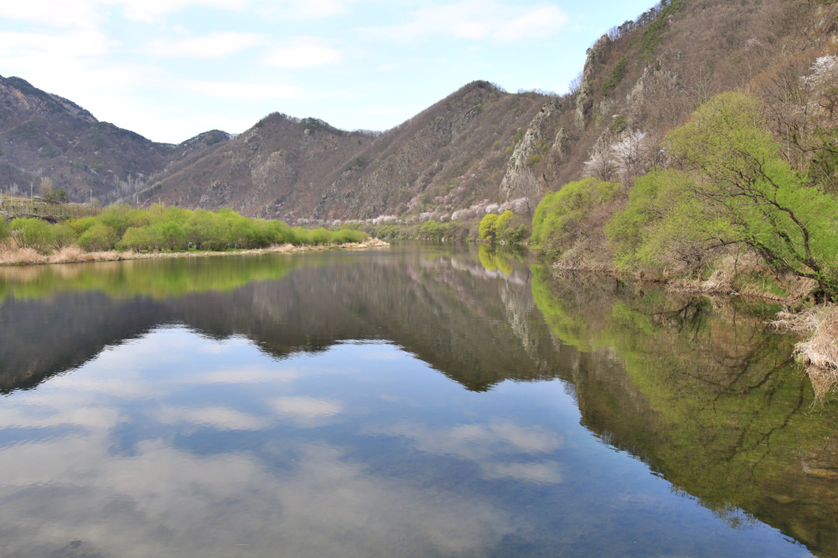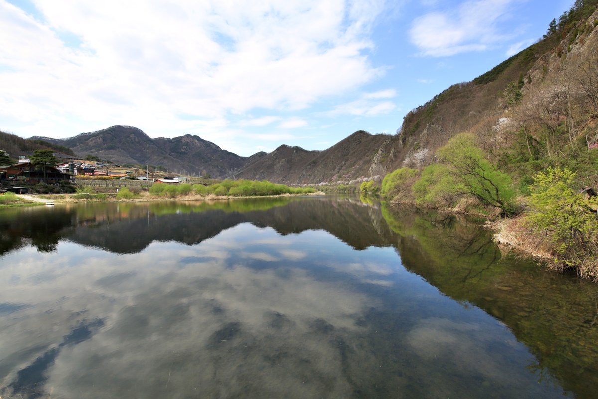 무주에서 벚꽃이 가장 늦게 피는 금강마실길 잠두마을 옛길 구간에도 봄물이 흐른다.