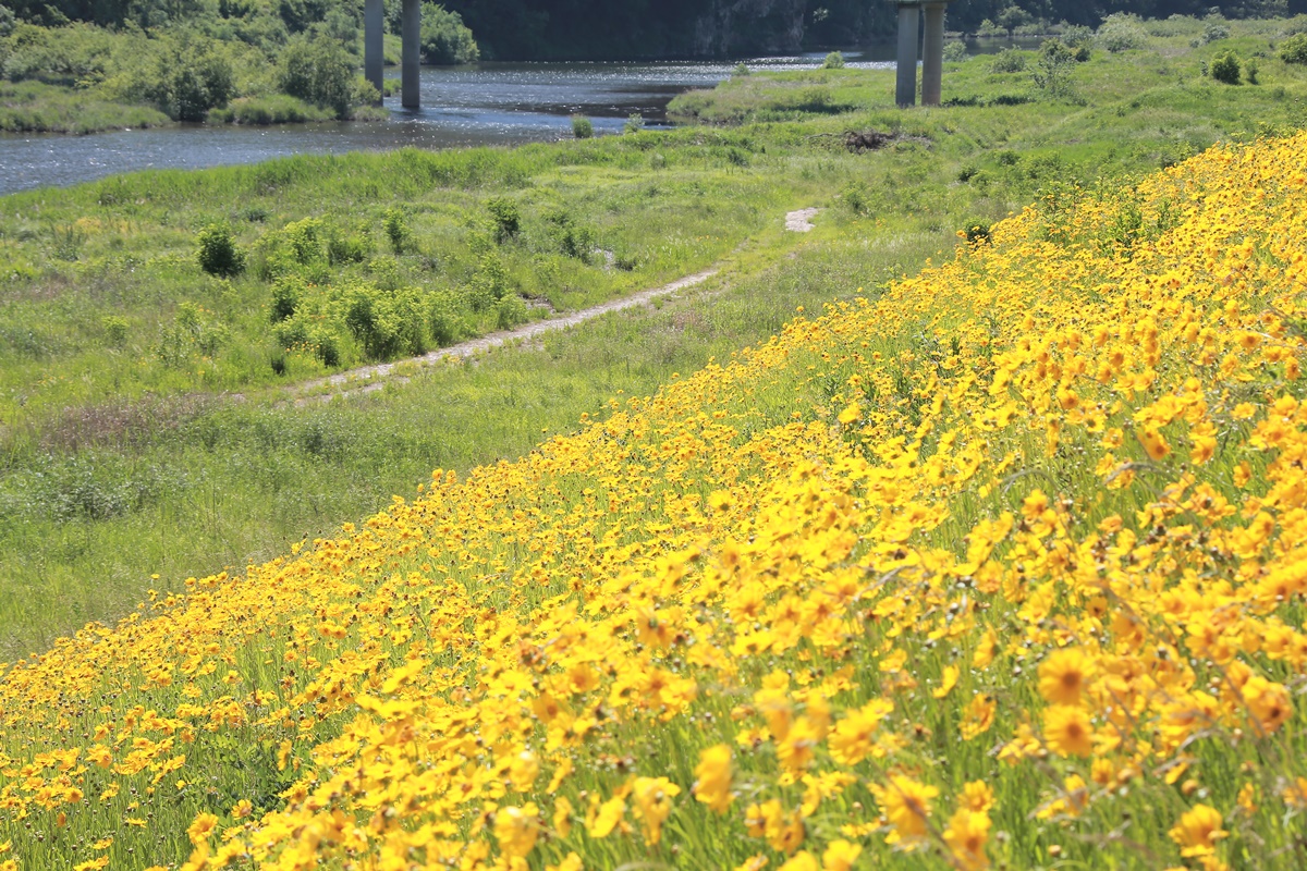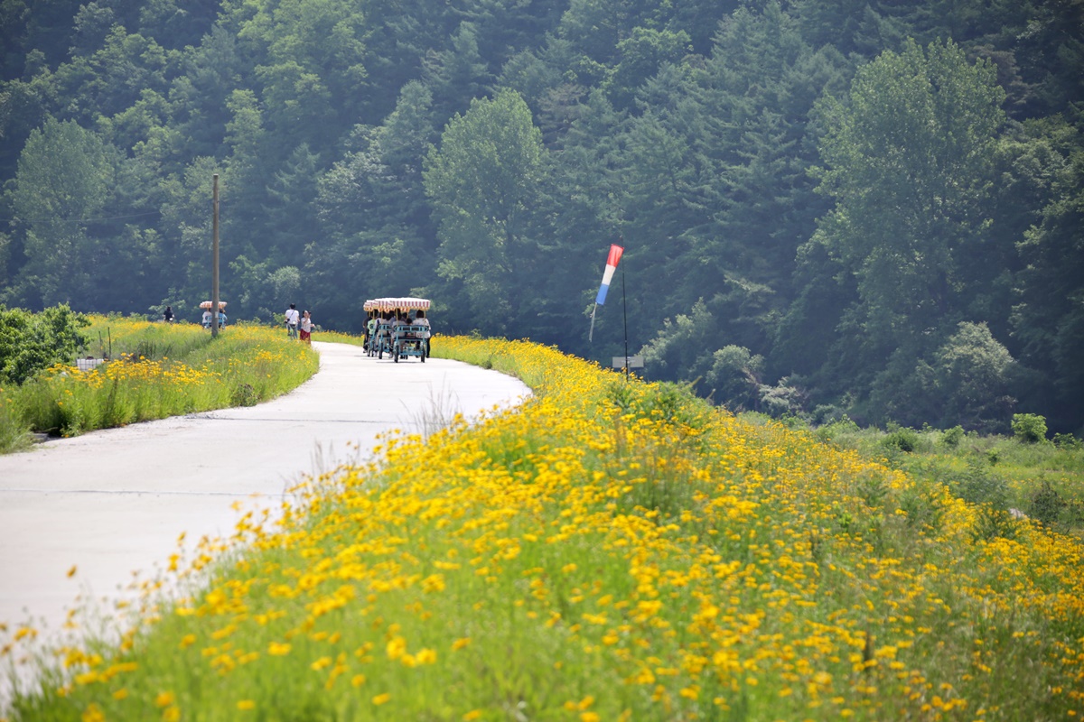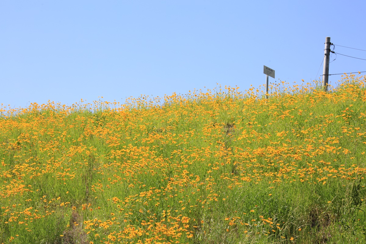 무주군 무주읍 내도로 앞섬마을에서 뒷섬마을 금강 제방길에 금계국이 만발했다. 장장 3.5km에 이르는 꽤 긴 거리다. 마을과 마을을 잇는 자동차 길 옆으로 난 금강 제방길이다. 한적해서 걷기에도 좋다.