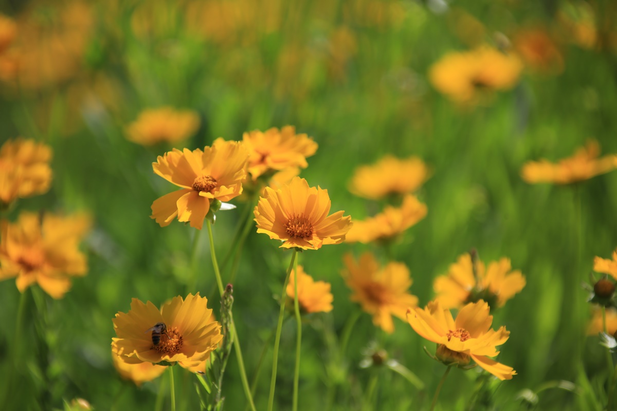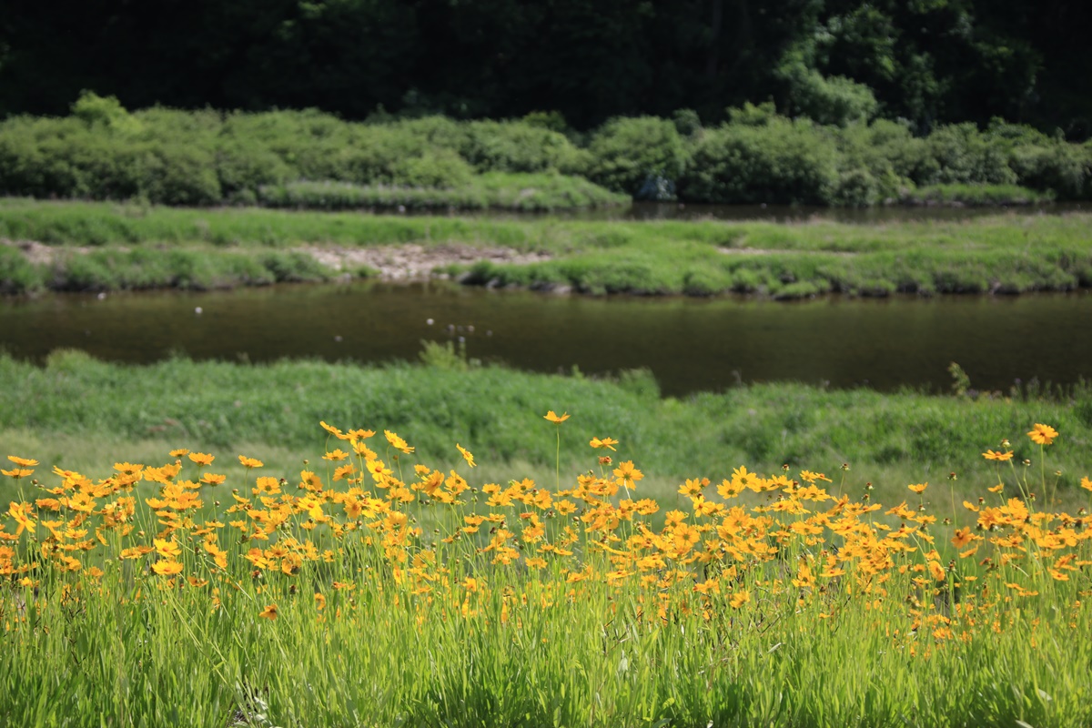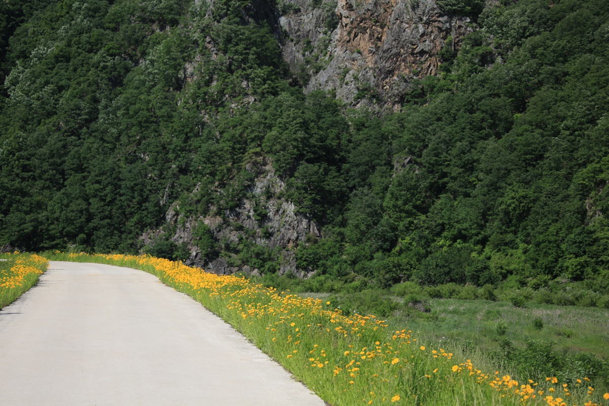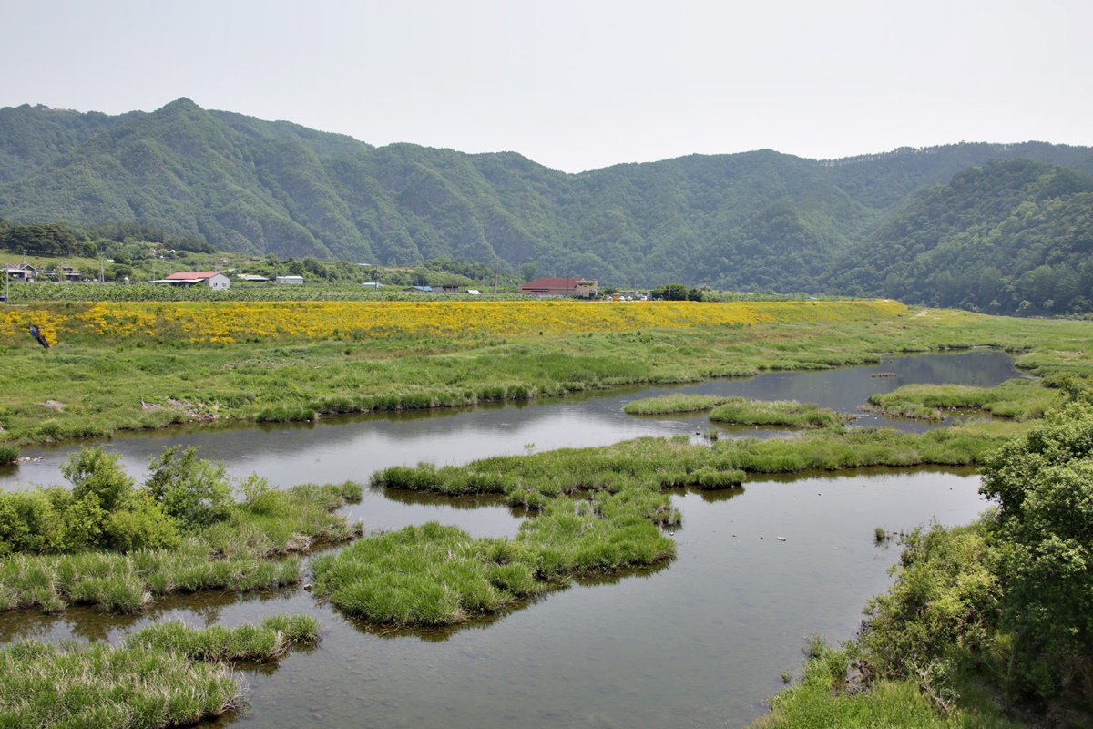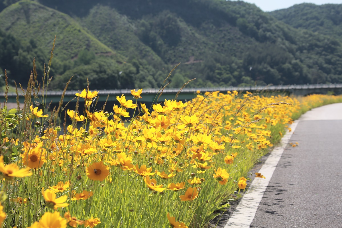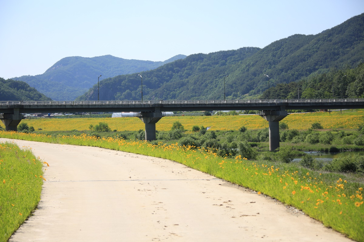무주군 무주읍 내도로 앞섬마을에서 뒷섬마을 금강 제방길에 금계국이 만발했다. 장장 3.5km에 이르는 꽤 긴 거리다. 마을과 마을을 잇는 자동차 길 옆으로 난 금강 제방길이다. 한적해서 걷기에도 좋다.