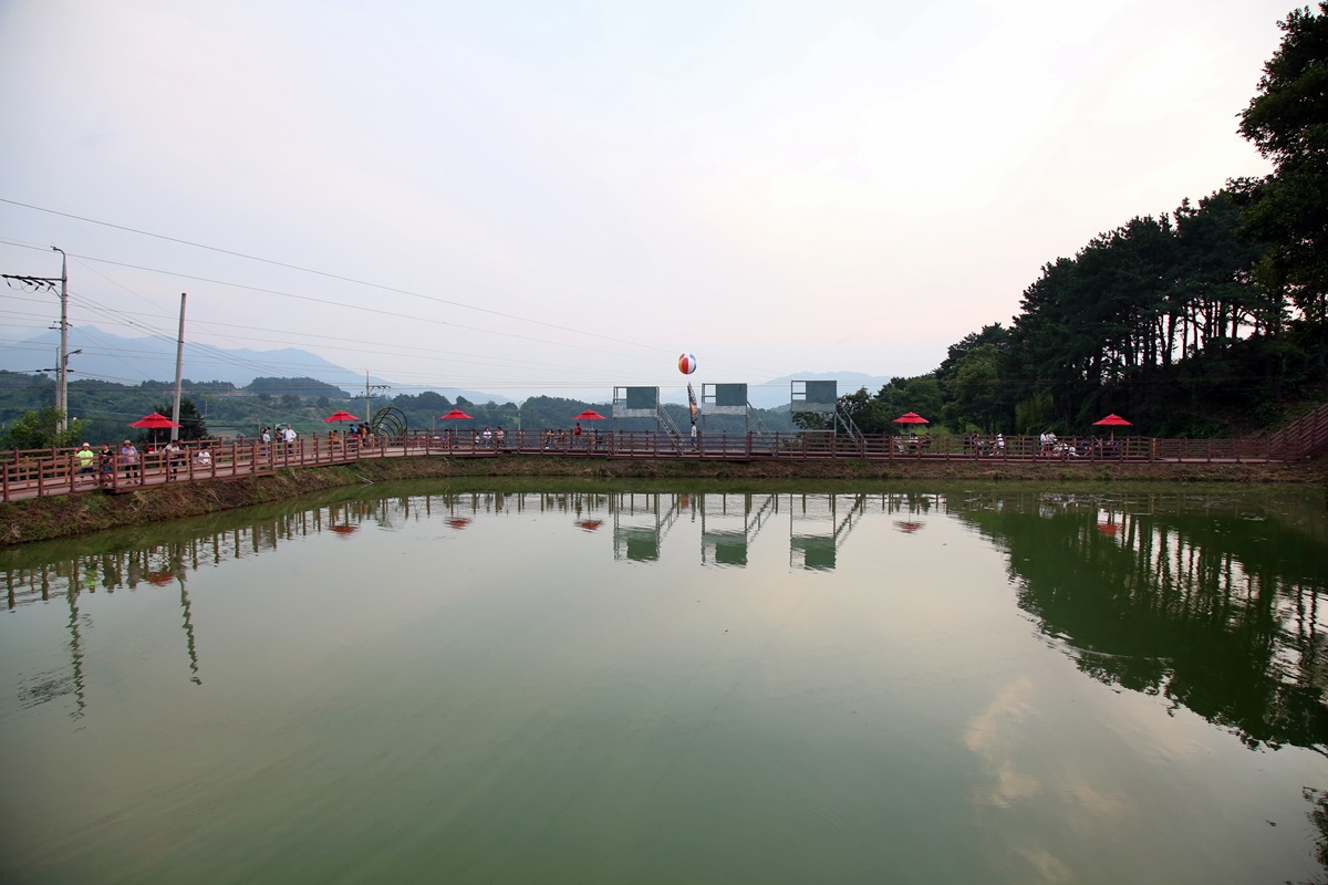 한지로 싼 뽕나무 숯과 말린 쑥, 소금 뭉치를 긴 줄에 매달고 불을 붙이면 줄을 타고 들어가는 불꽃이 장관을 이룹니다. 이날 행사에 사용한 낙화봉은 마을 주민들이 열흘 동안 만든 3,600개 이상 사용되었습니다. 소금이 들어 간 한지 뭉치가 타들어갈 때 나는 소리와 바람에 날리는 숯가루 불꽃이 물 위로 날리며 절정에 달합니다.