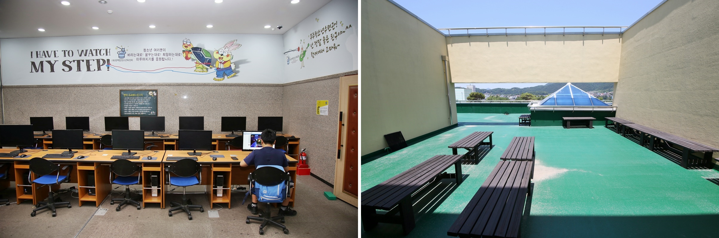 그중 청소년수련관은 가장 높은 곳에 자리 잡고 있는데, 2층에서 바라보면 남대천과 무주읍내 전경이 한눈에 들어온다. 특이한 것은 3층 건물이지만 앞에서부터 차례로 뒤로 밀려나는 건물 배치를 통해 단층 건물처럼 보이게 했다는 점이다. 건축가는 이 부분에 대해 ‘무주 읍내를 너무 압도하지 않도록 하기 위해서’라고 했다.