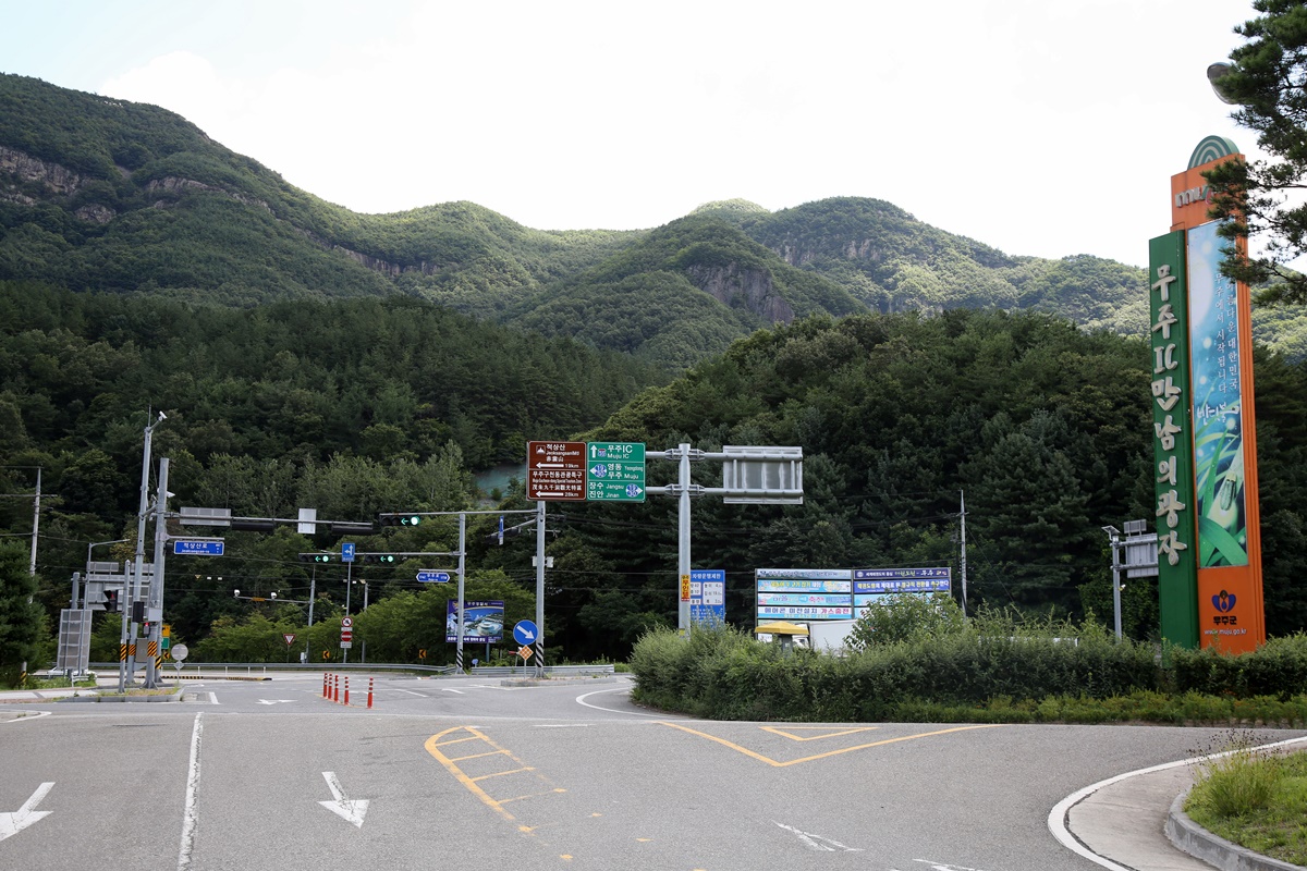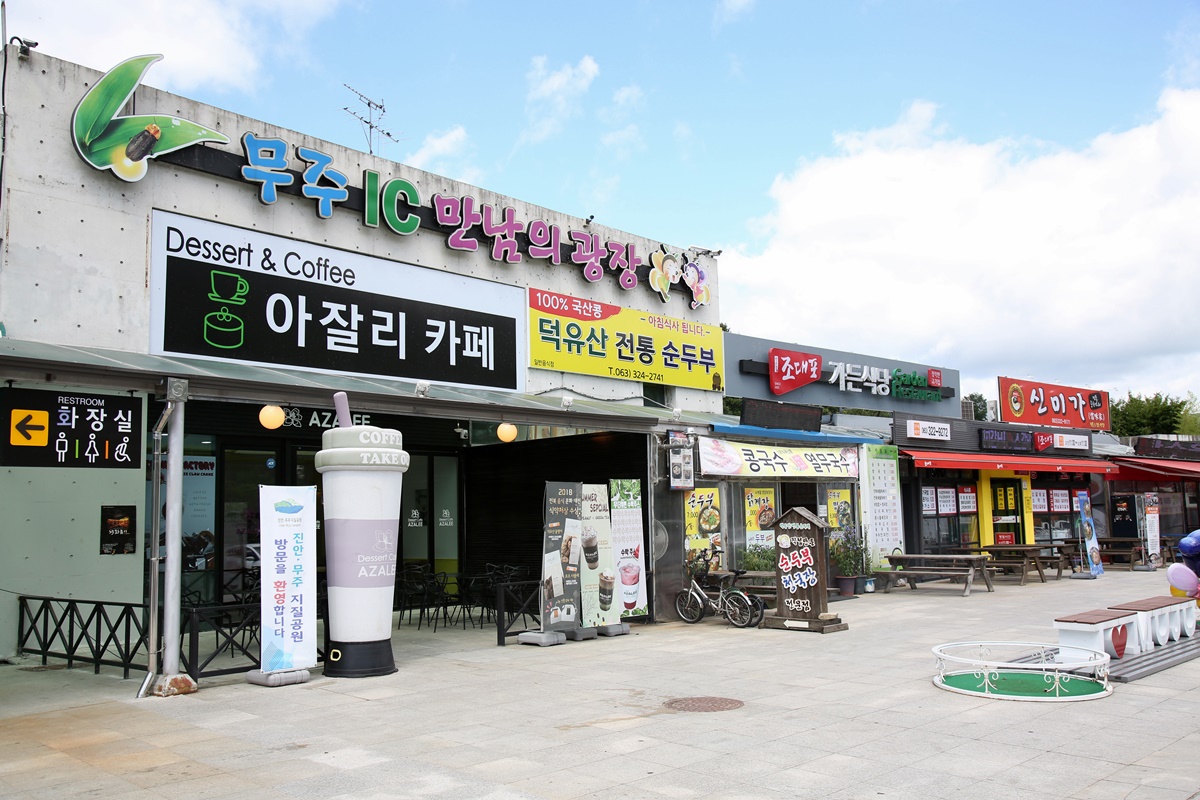 무주를 만나는 첫 관문은 무주IC다. 무주IC를 나오면 19번 국도가 지나는 교차로가 있고 그 앞으로는 부채꼴 모양으로 길게 늘어선 만남의 광장이라는 이름의 휴게공간이 들어서 있다. 이미 소문난 음식점이 여럿 있어 주말이면 줄을 서야 맛을 볼 수 있을 정도로 무주의 명소가 되었다.