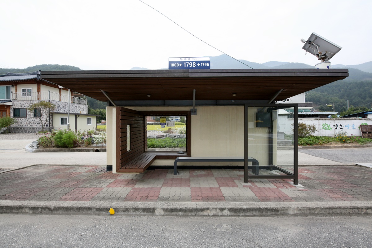 요즘 전국 대부분의 시골버스정류장은 차가운 스테인리스나 철제 기둥에 형형색색의 원색 지붕을 이고 있다. 시선을 한 번에 잡아당기는 시각적인 효과는 있을지 모르나 시골버스의 낭만은 느껴지지 않는다. 무주의 버스정류장은 작은 건축물에 불과하지만 그곳을 이용하는 사람들을 배려하는 건축가의 따스한 마음과 철학이 담겨 있다.