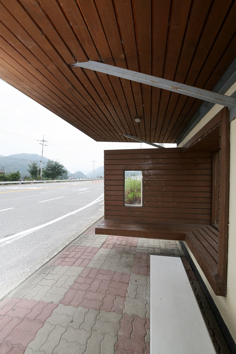 또한 벽채의 한 부분을 도려내 창을 내고 뒤편 풍경을 끌어들였다. 그 결과 훌륭한 액자를 걸어놓은 듯 사계절 제각각의 멋진 그림을 버스정류장에 앉으면 감상할 수 있다. 그리고 콘크리트 벽채에 ‘ㄱ’자로 교차하는 의자를 만들어 덧붙였다. 버스를 기다리는 사람들끼리 ‘ㄱ’자의 의자에 앉아 시선을 교차한다. 단지, 버스정류장이 차를 기다리는 것만이 목적이 아니라 타인과 관계를 맺는 공간으로도 기능할 수 있다는 것을 잘 보여주는 설계라 할 수 있다.