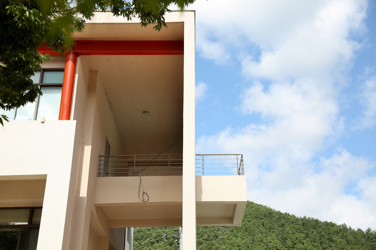 또 하나는 건물 측면에 돌출된 공간을 만들고 창(窓)을 내었다는 것이다. 적상면 주민자치센터에도 그런 공간이 있다. 건축가는 이곳을 만든 이유를 ‘적상산을 각별하게 바라볼 수 있는 위치이기 때문이다’라고 했다. 외부 진입로를 통해 3층으로 오르다 보면 나타나는 우측 돌출부에서 바라보는 적상산의 모습은 크고 웅장하다. 바위절벽이 병풍처럼 남북에 걸쳐 산을 감싸고 있는 모습을 이곳에서 한 눈에 조망할 수 있다.
