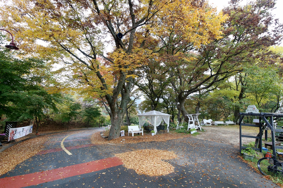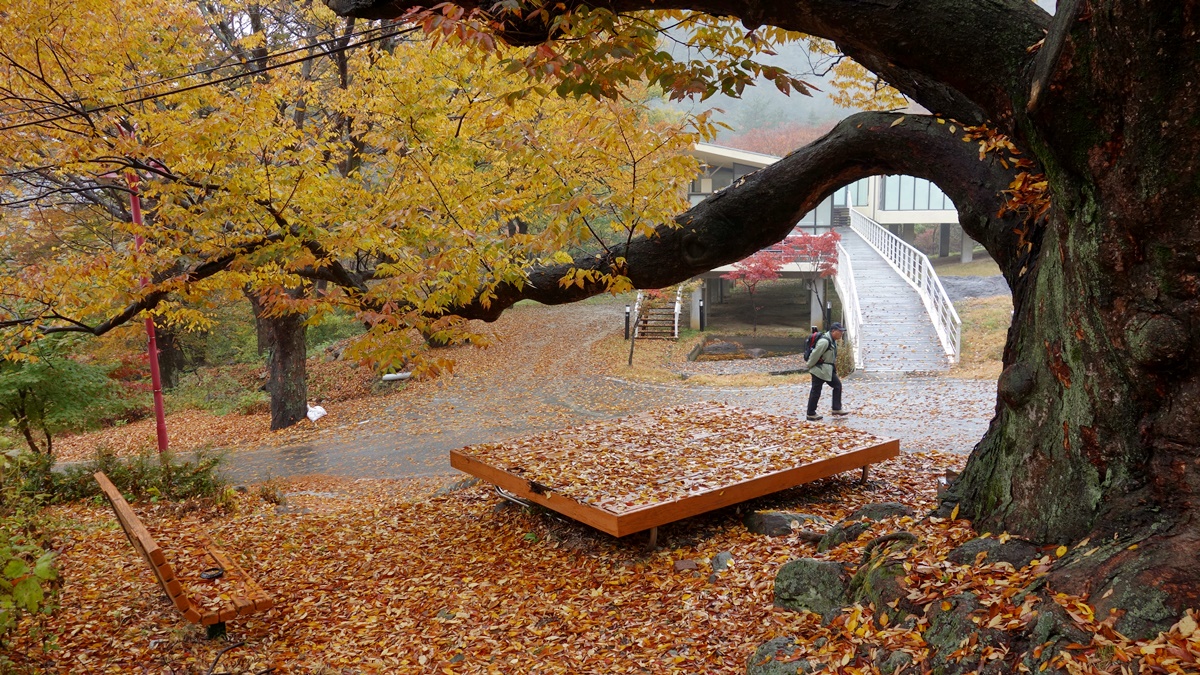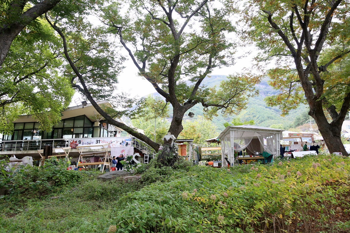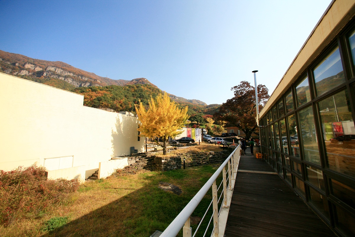 두 번째 전시공간도 기둥을 이용해 몸체를 지면으로부터 띄웠다. 그러다보니 건물 뒤편 계곡을 건물 아래 공간을 통해 드나들 수 있다. 그리고 가운데 건물 앞에 서면 마을의 중심 당산나무와 마주하게 된다. 나무 아래 정자는 여름이면 마을 주민들의 사랑방이 되어 매일같이 건축물을 바라볼 수 있다.