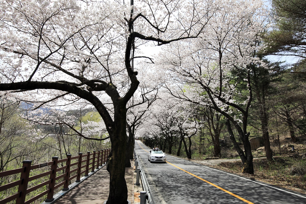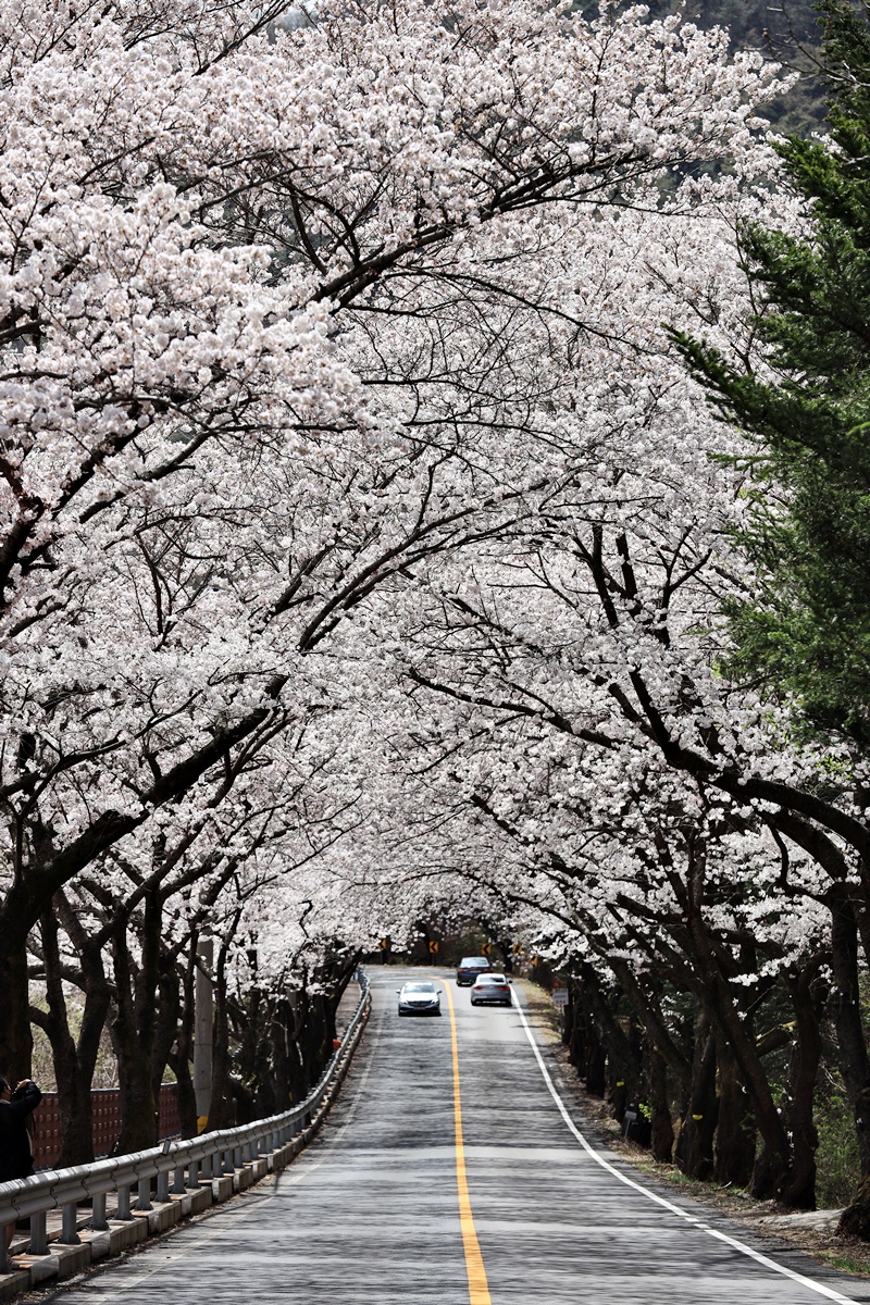무주 벚꽃 로드라 할 만한 길고 깊은 길이 남대천을 따라 이어진다. 금강과 합류하는 남대천 하류 무주읍 대차리 서면마을에서 시작해 무주읍을 지나 설천면 나제통문, 그리고 구천동 계곡을 따라 절정을 이룬다. 그 길이가 무려 40여 km에 달한다. 구천동 벚꽃길은 한때 축제를 열 만큼 소문난 길이다. 벚꽃이 만개하면 한눈에 쏙 들어오는 굽은 길에서 사진을 찍는 인파로 인해 지나는 차량들도 서행을 한다. 지금은 도로변에 나무 덱을 깔아 산책로를 만들어 놨다.