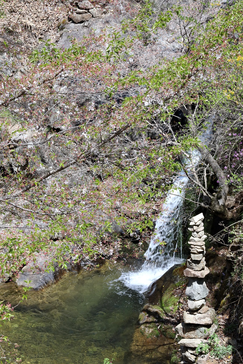 용가마골은 송 이장이 틈나는 대로 손수 가꾸고 있다. 골짜기 입구부터 군데군데 보이는 70~80여 기의 돌탑도 송 이장이 쌓았다. “별거 없어요. 돌을 나르는 게 힘들지, 돌탑 쌓은 것은 쉬워요”라면서 아무렇지 않게 얘기하지만 어떤 구조물도 없이 오직 손으로만 돌탑을 쌓는 게 어디 쉬운 일인가. 송 이장 집이 보일 즈음 우렁찬 물소리가 들린다. 용이 승천했다는 용등폭포다. 폭포 주변에도 돌탑이 즐비하다. 막 꽃잎을 떨군 벚나무 한 그루가 폭포 앞을 지키고 있다.