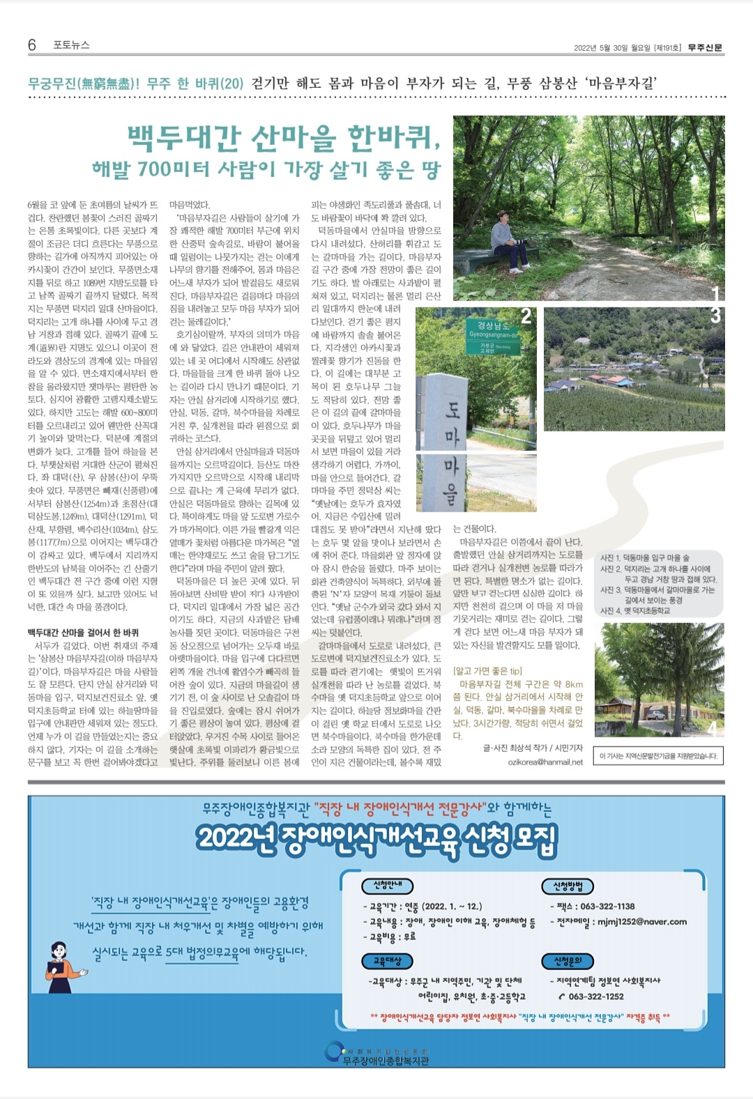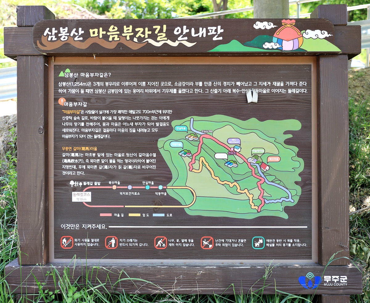 서두가 길었다. 이번 취재의 주제는 ‘삼봉산 마음부자길(이하 마음부자길)’이다. 마음부자길은 마을 사람들도 잘 모른다. 단지 안실 삼거리와 덕동마을 입구, 덕지보건진료소 앞, 옛 덕지초등학교 터에 있는 하늘땅마을 입구에 안내판만 세워져 있는 정도다. 언제 누가 이 길을 만들었는지는 중요하지 않다. 기자는 이 길을 소개하는 문구를 보고 꼭 한번 걸어봐야겠다고 마음먹었다.