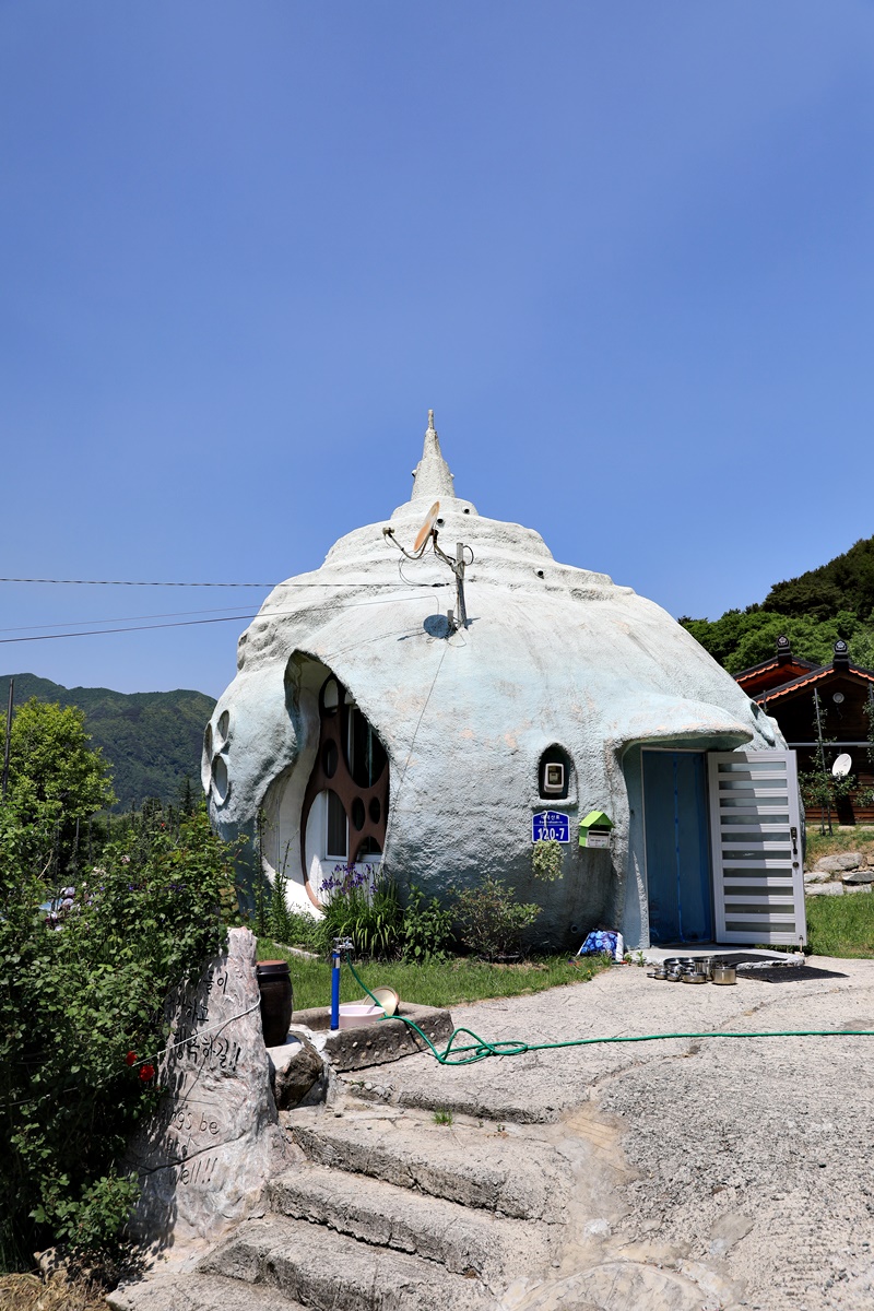 갈마마을에서 도로로 내려섰다. 큰 도로변에 덕지보건진료소가 있다. 도로를 따라 걷기에는 햇빛이 뜨거워 실개천을 따라 난 농로를 걸었다. 북수마을 옛 덕지초등학교 앞으로 이어지는 길이다. 하늘땅 정보화마을 간판이 걸린 옛 학교 터에서 도로로 나오면 북수마을이다. 북수마을 한가운데 소라 모양의 독특한 집이 있다. 전 주인이 지은 건물이라는데, 볼수록 재밌는 건물이다.