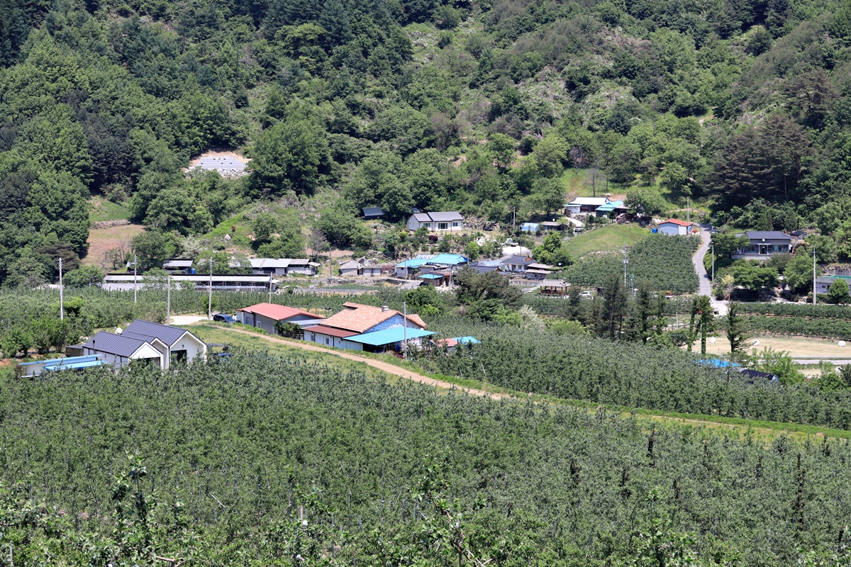 덕동마을에서 안실마을 방향으로 다시 내려섰다. 산허리를 휘감고 도는 갈마마을 가는 길이다. 마음부자길 구간 중에 가장 전망이 좋은 길이기도 하다. 발 아래로는 사과밭이 펼쳐져 있고, 덕지리는 물론 멀리 은산리 일대까지 한눈에 내려다보인다. 걷기 좋은 평지에 바람까지 솔솔 불어온다. 지각생인 아카시꽃과 찔레꽃 향기가 진동을 한다. 이 길에는 대부분 고목이 된 호두나무 그늘도 적당히 있다. 전망 좋은 이 길의 끝에 갈마마을이 있다. 호두나무가 마을 곳곳을 뒤덮고 있어 멀리서 보면 마을이 있을거라 생각하기 어렵다. 가까이, 마을 안으로 들어간다. 갈마마을 주민 정덕상 씨는 “옛날에는 호두가 효자였어. 지금은 수입산에 밀려 대접도 못 받아”라면서 지난해 땄다는 호두 몇 알을 맛이나 보라면서 손에 쥐어 준다. 마을회관 앞 정자에 앉아 잠시 한숨을 돌렸다. 마주 보이는 회관 건축양식이 독특하다. 외부에 돌출된 ‘N’자 모양의 목재 기둥이 돋보인다. “옛날 군수가 외국 갔다 와서 지었는데 유럽풍이래나 뭐래나”라며 정 씨는 덧붙인다.