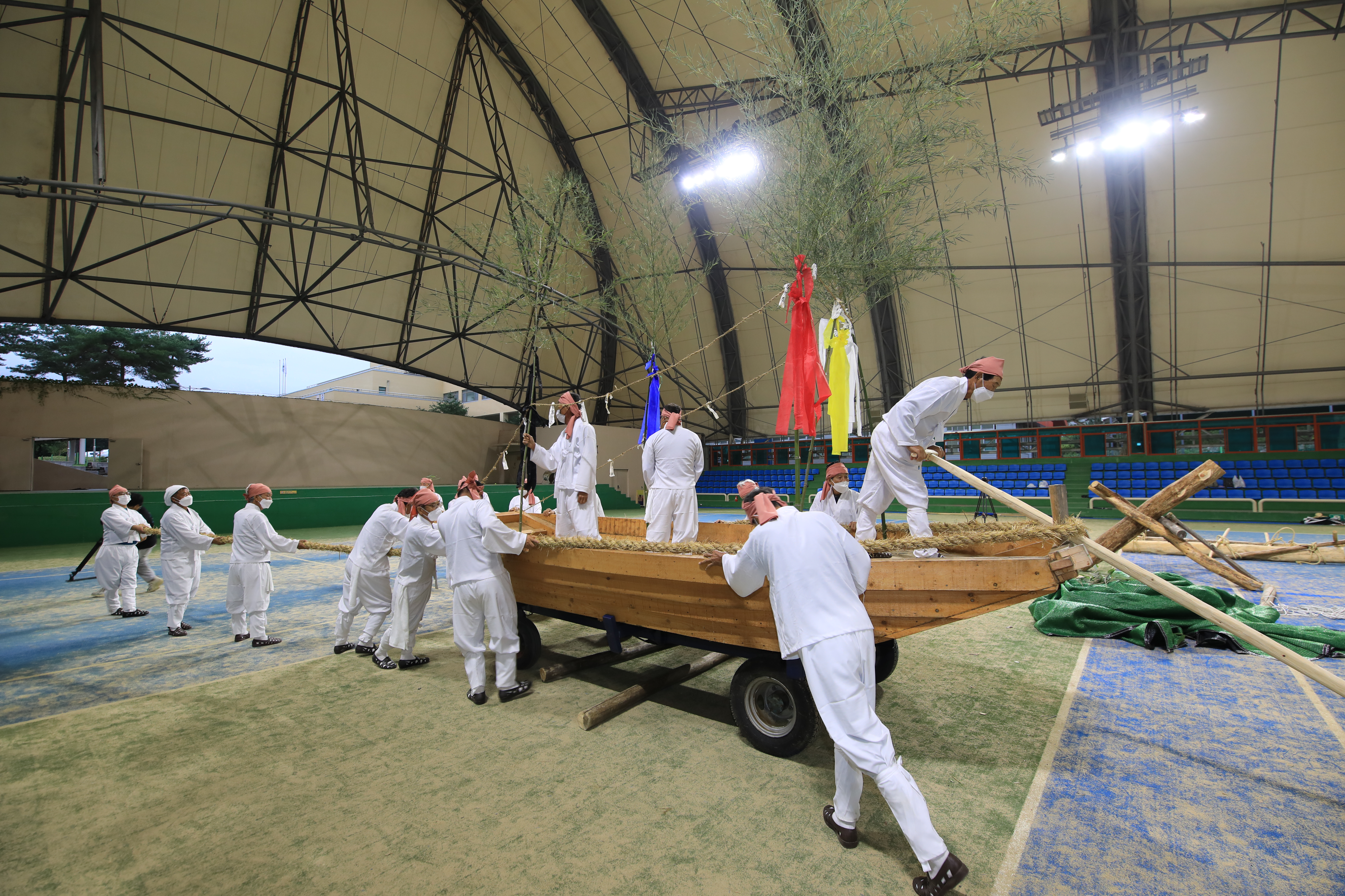 넷째 날에는 무주에서 처음 복원된 부남면의 ‘뱃소배묻이굿놀이’ 공연이 있었다. 금강이 흐르는 부남면 대소마을은 나룻배가 중요한 이동수단이었다. 대소마을의 뱃소, 즉 뱃터는 금강을 따라 충청지역까지 왕래하던 교역로였다. 특히 마을 사람들은 농사를 짓기 위해, 학생들은 학교를 가기 위해 배를 타고 강을 건너 다녀야 했다. 그런 의미에서 ‘뱃소배묻이굿놀이‘는 새로 만든 배를 처음으로 강에 띄울 때 행해지는 의식의 일종이었다. 부르기도 힘든 생소한 이름 때문에 공연을 시작하기 전까지 관객들은 다들 궁금해 할 수밖에 없었다. 하지만 나무를 자르고 배를 만드는 과정을 재현하는 굿놀이를 보면서 공연을 이해할 수 있었다.