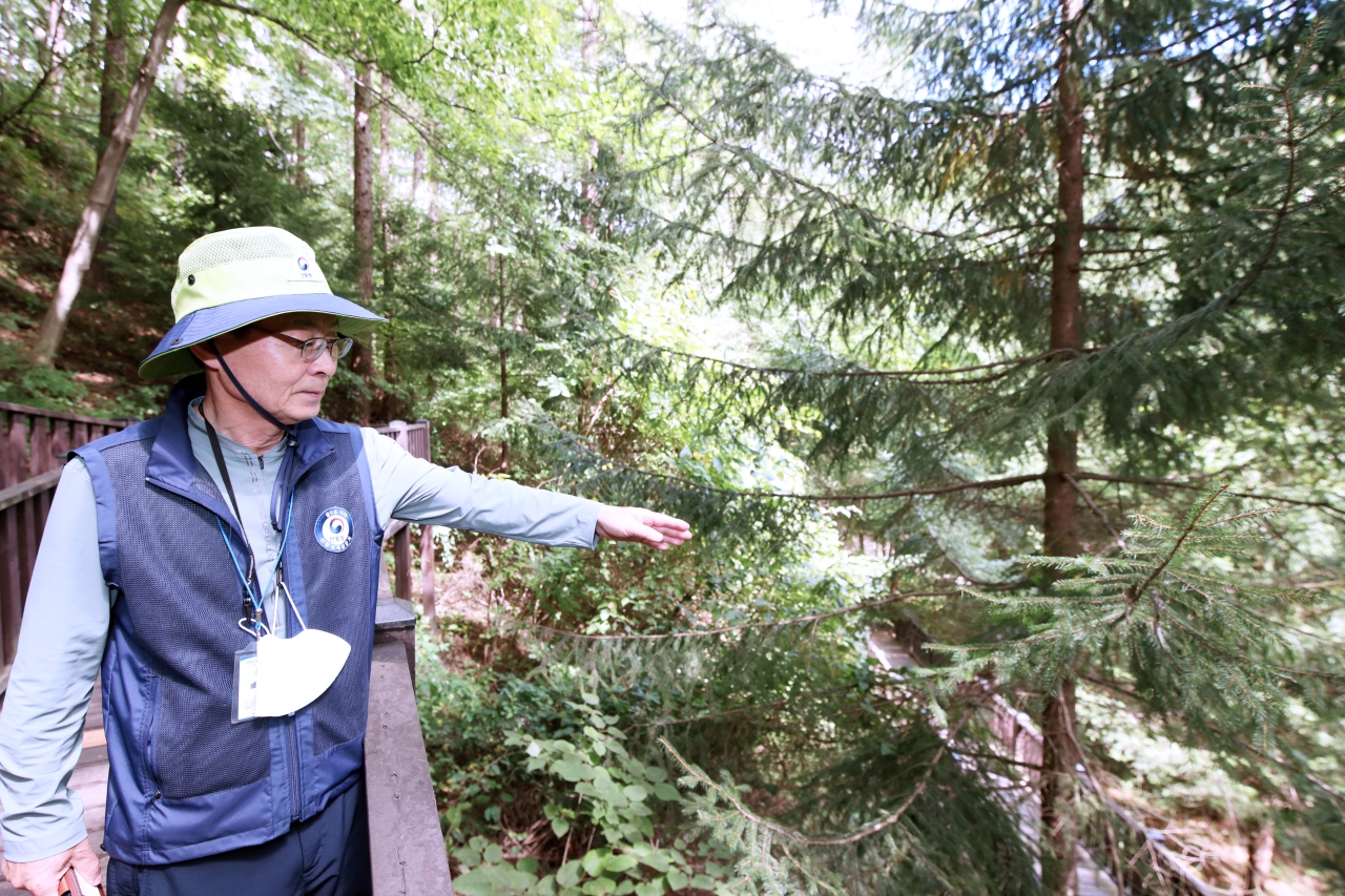 독일가문비나무 숲은 휴양림 입구에서 약 600미터 거리에 있다. 김병전 해설사와 함께 숲으로 향했다. 숲을 돌아볼 수 있는 130미터 길이의 산책로는 경사가 완만하고 나무 덱이 놓여 있어 접근이 쉽다. 산책로를 따라 숲으로 들어가면 하늘 높이 곧게 치솟은 독일가문비나무가 늠름하고도 우아한 자태를 드러낸다. 입구에 낙엽송 군락이 있어 나무의 겉모습만으로는 쉽게 구분하기 어렵다. 하지만 김병전 숲해설사의 말 한마디에 낙엽송과 비슷한 종인 구상나무, 가문비나무, 종비나무 등 상록침엽수들을 손쉽게 구분하는 법을 배울 수 있었다.