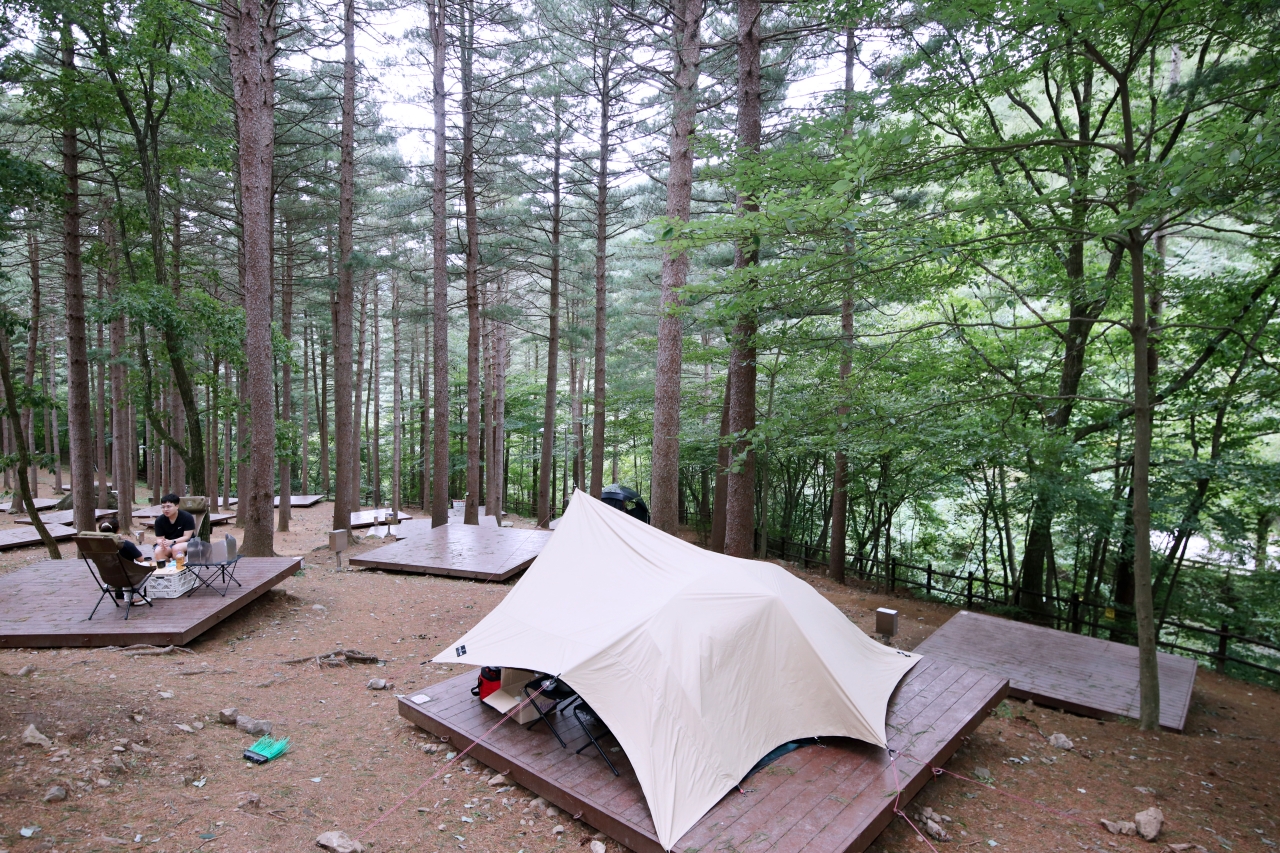 덕유산자연휴양림에는 독일가문비나무 숲 못지않은 잣나무 숲도 있다. 현재 야영장으로 이용되는 잣나무 숲에는 28개의 야영 덱이 설치되어 있다. 서울에서 왔다는 젊은 부부는 “체크아웃 시간이 다가오는데, 가기 싫어서 뭉그적거리고 있어요”라며 숲을 떠나기 싫은 아쉬운 마음을 전했다.