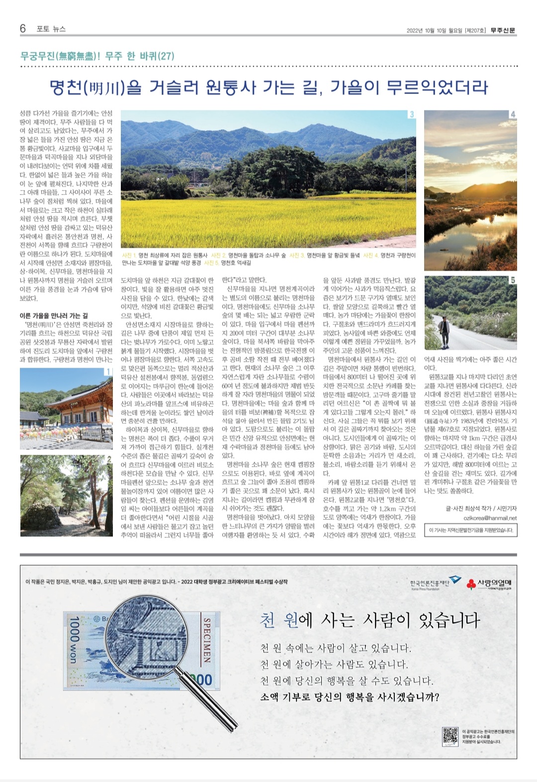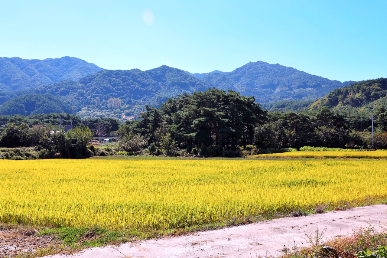 성큼 다가선 가을을 즐기기에는 안성 땅이 제격이다. 무주 사람들을 다 먹여 살리고도 남았다는, 무주에서 가장 넓은 들을 가진 안성 땅은 지금 온통 황금빛이다. 사교마을 입구에서 두문마을과 덕곡마을을 지나 외당마을이 내려다보이는 언덕 위에 차를 세웠다. 한없이 넓은 들과 높은 가을 하늘이 눈 앞에 펼쳐진다. 나지막한 산과 그 아래 마을들, 그 사이사이 푸른 소나무 숲이 점처럼 찍혀 있다. 마을에서 마을로는 크고 작은 하천이 실타래처럼 안성 땅을 적시며 흐른다. 부챗살처럼 안성 땅을 감싸고 있는 덕유산 자락에서 흘러온 통안천과 명천, 사전천이 서쪽을 향해 흐르다 구량천이란 이름으로 하나가 된다. 도치마을에서 시작해 안성면 소재지와 평장마을, 상·하이목, 신무마을, 명천마을을 지나 원통사까지 명천을 거슬러 오르며 이른 가을 풍경을 눈과 가슴에 담아 보았다.