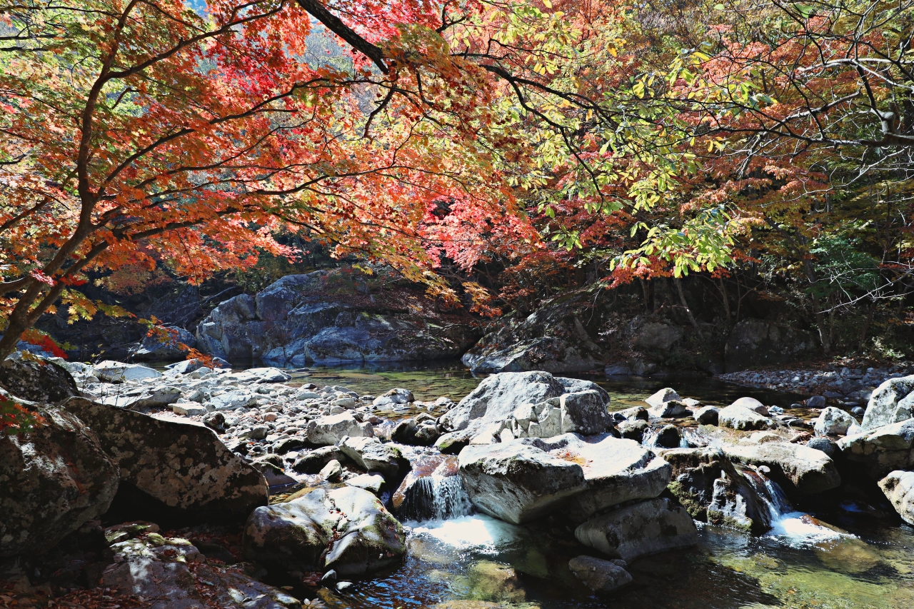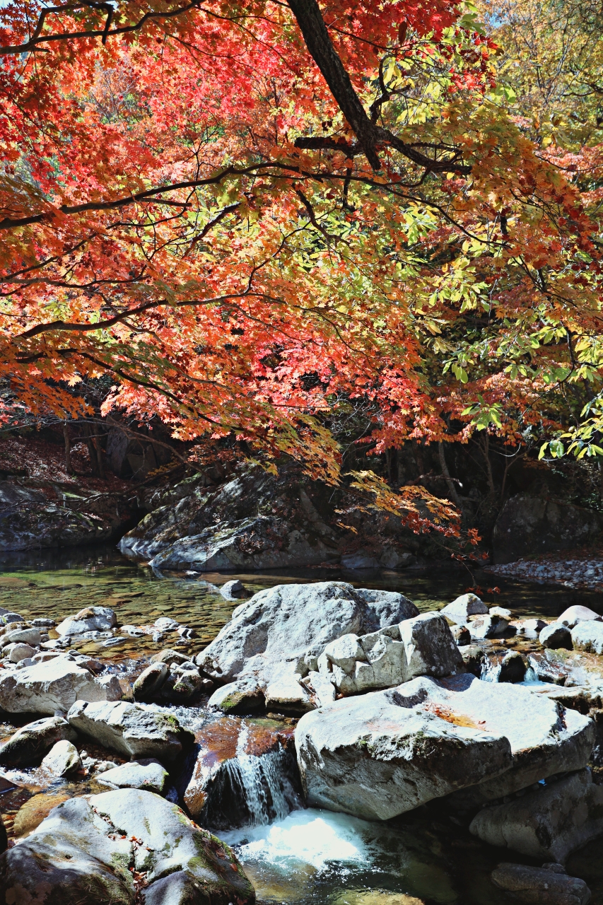 올 가을 무주구천동 계곡의 단풍은 예년에 비해 더 곱고 화려하다. 기온이 뚝 떨어지면서 며칠 사이 가을빛이 깊게 물들었다. 사진은 어사길 2구간 청류대와 비파담 일대 오늘 모습으로 단풍은 이번 주말쯤이 가장 좋을 것 같다.