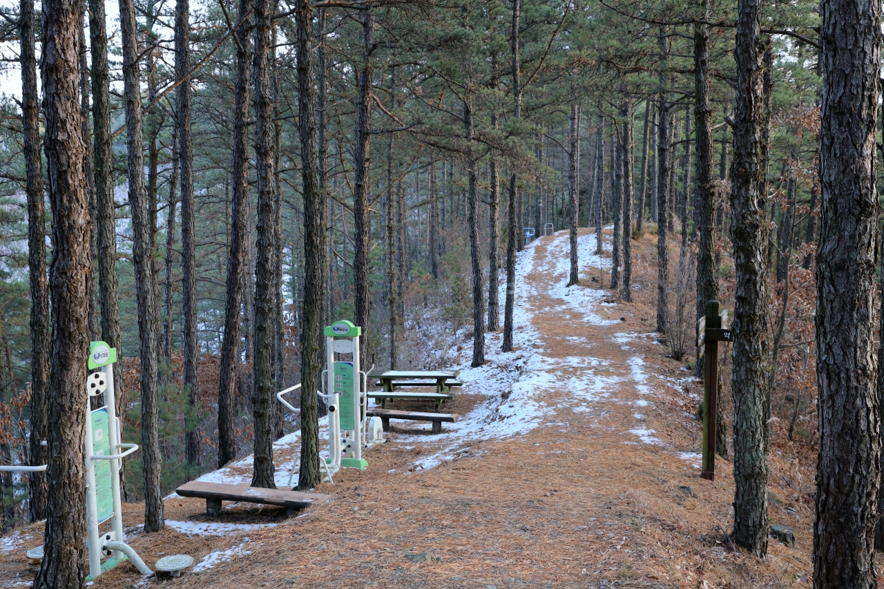 어둠이 더 짙어지기 전에 길을 서둘렀다. 올라온 길을 뒤로 하고 제2 전망대 방향의 능산을 걷다가 ‘약수터’로 내려섰다. 이 길은 무주고등학교를 지나 읍내로 이어진다.