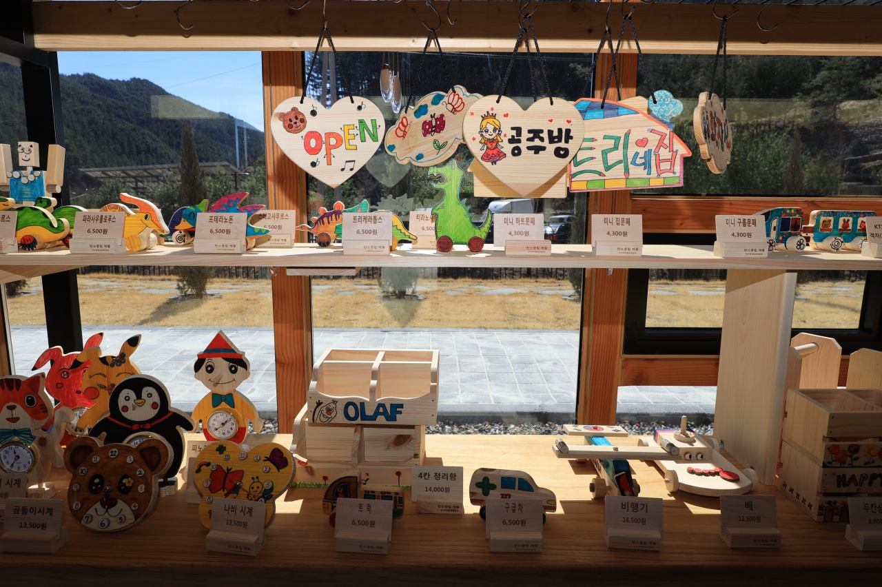 1층에는 이외에도 전시실 겸 기념품 판매장이 있다. 소나무와 층층나무를 동그랗게 깎아 만든 원형 마그넷, 참죽나무 등으로 만든 별·달 마그넷, 우드 풍경, 도형 자동차, 병원 놀이, 낚시 교구 등 다양한 원목 상품이 전시되어 있다.