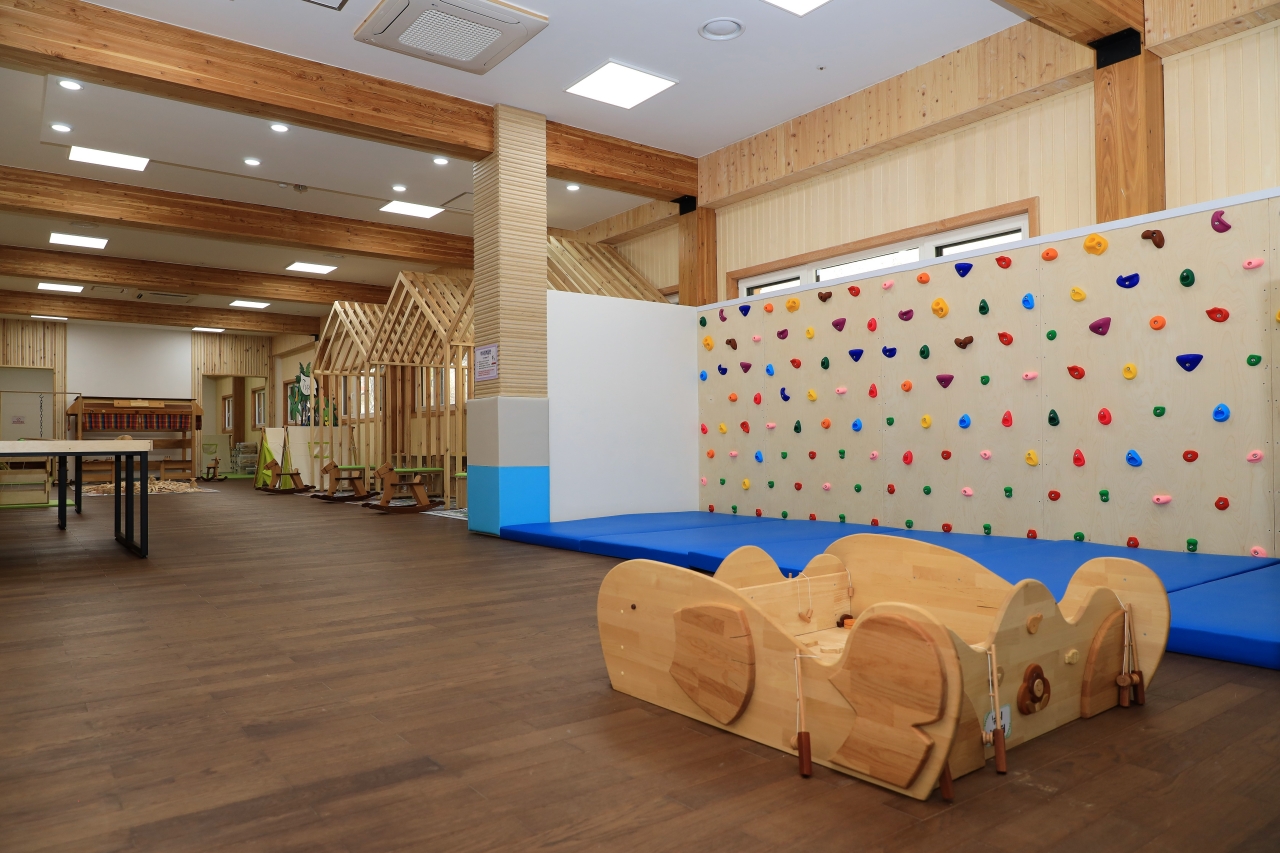 큰 건물에 비해 공간 구성은 단순했다. 1층 방문자센터 앞에 있는 ‘상상놀이터’는 아이들을 위한 공간이다. 편백풀장과 기차놀이존, 목재놀이존, 카프라존, 목재교구존, 트램폴린, 암벽등반 등 마음껏 상상의 나래를 펼칠 수 있는 놀이 시설이 들어서 있다.