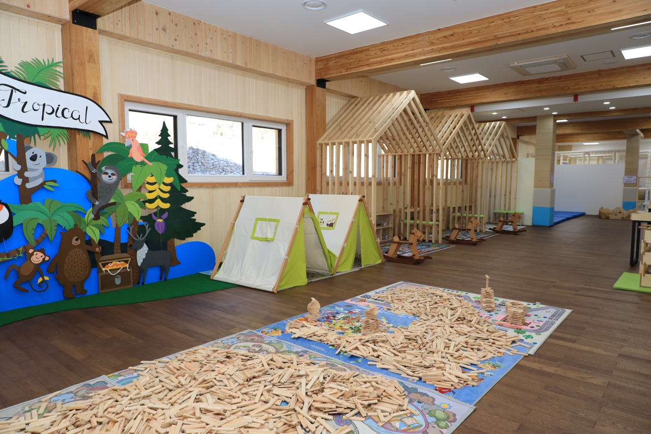 ‘목재교구존’, ‘목재놀이존‘은 원목 교구를 직접 손으로 만지고 놀이를 통한 학습을 할 수 있는 공간이고, 아이들이 안전하게 즐길 수 있는 ’암벽등반‘, ’트램폴린‘도 설치되어 있다.