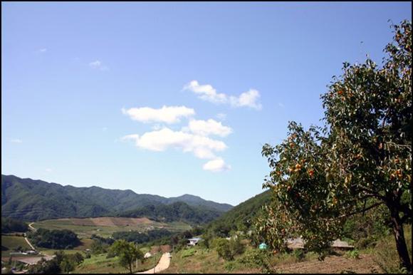 떠난 빈집 앞에는 감이 주렁주렁 열려 있고,