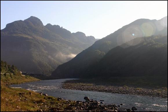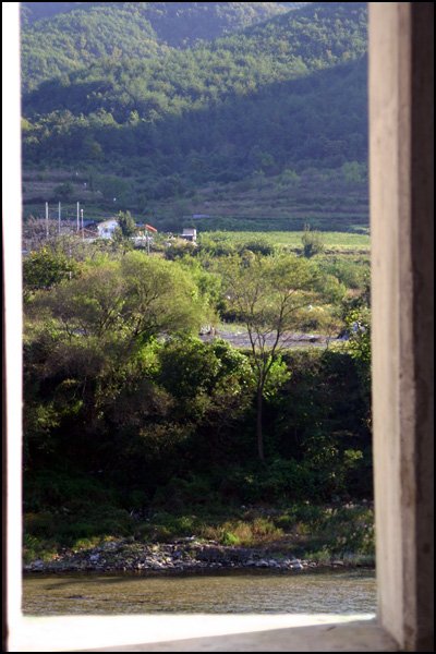강물은 산안개 따라 흘러가고, 산은 강바람에 서서히 아침을 연다.