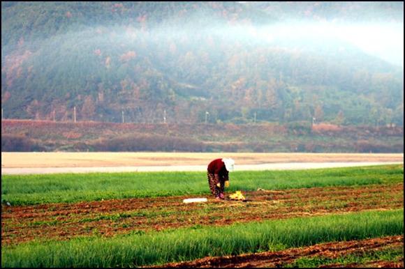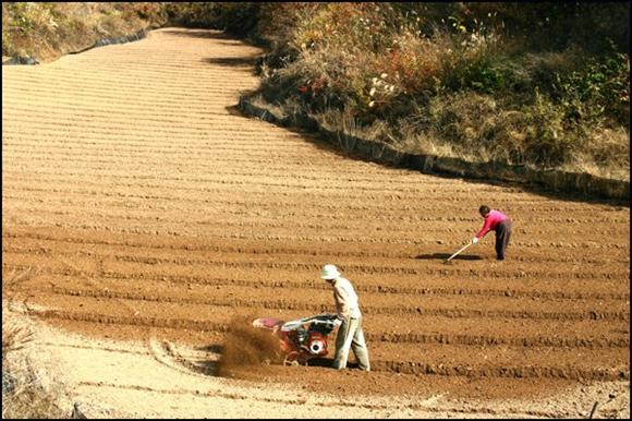 양파 심는 일을 하는 아주머니들은 멀리에서 오십니다.