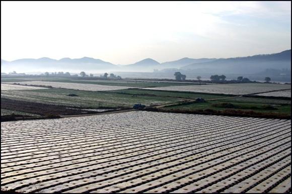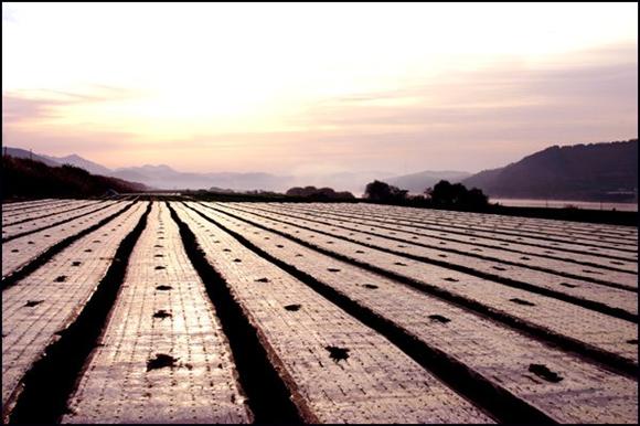 비닐을 먼저 씌우고, 구멍 난 사이 사이 양파 모종을 심지요.