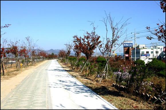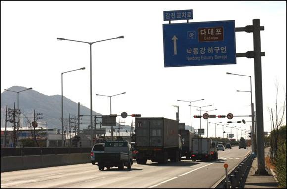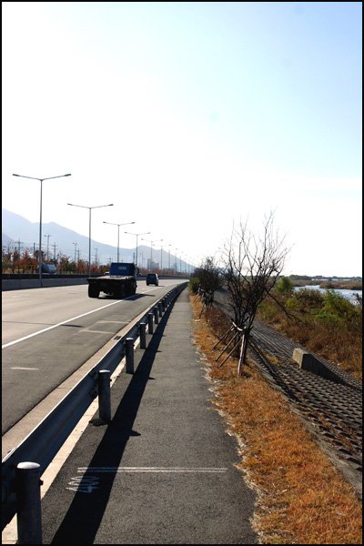낙동강은 곁에 있지만 강으로 내려 설 수가 없어 도로를 따라 걷습니다.