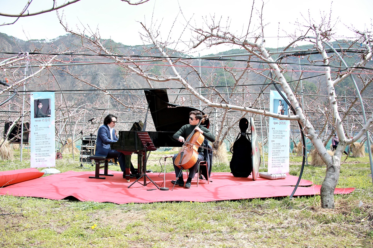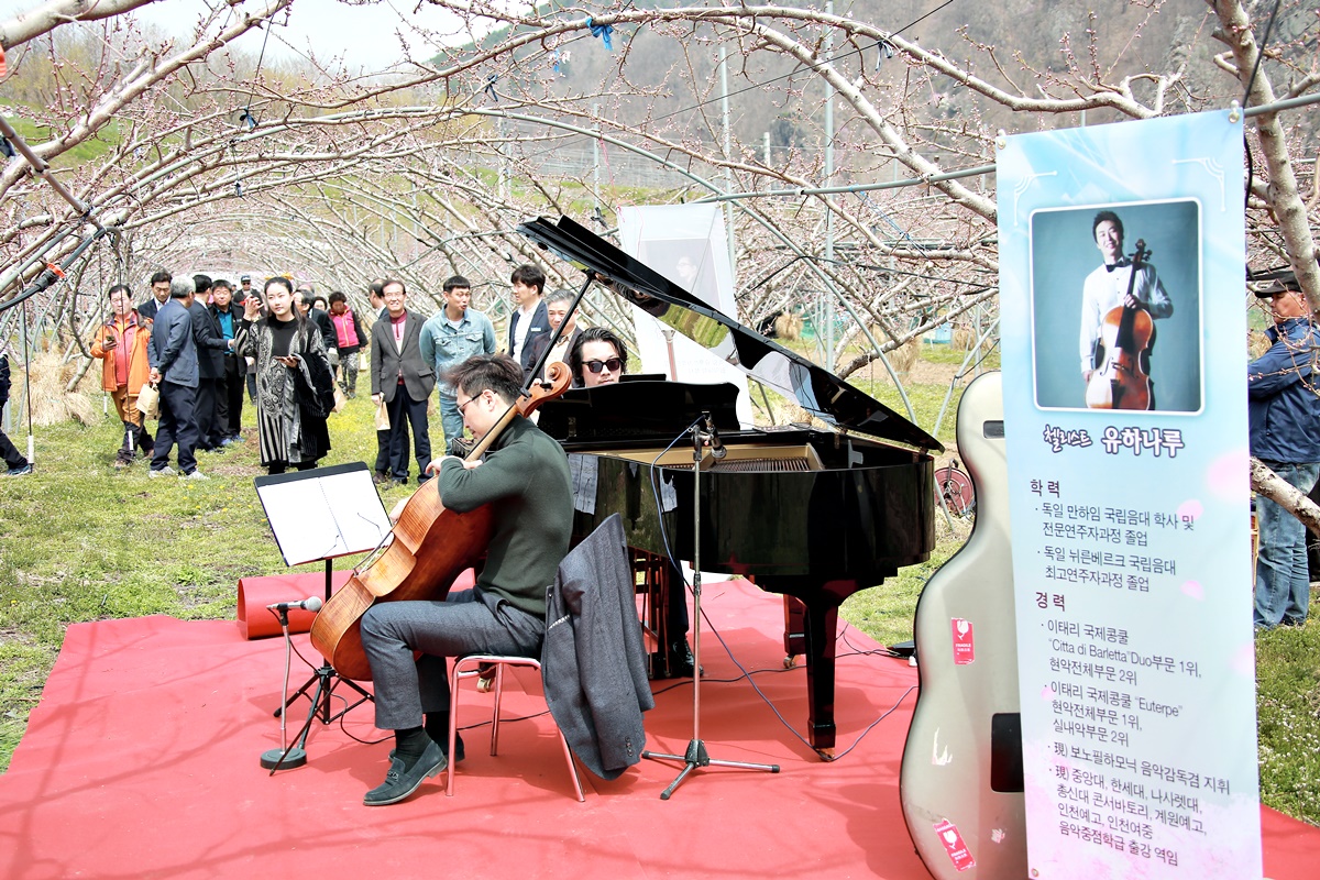 ‘2019 무주 봄꽃축제’의 하이라이트인 꽃길 걷기 행사는 앞섬마을 체험센터를 출발해 제방 길과 복숭아 밭 사이 농로를 돌아오는 코스(2km)를 배우 김응수 씨와 함께 걷는 시간을 가졌습니다. 걷다 지칠 때쯤엔 ‘봄, 꽃, 바람, 하늘’과 어우러진 복숭아꽃밭에서는 피아니스트 최훈락, 첼리스트 유하나루의 음악공연도 열렸습니다.