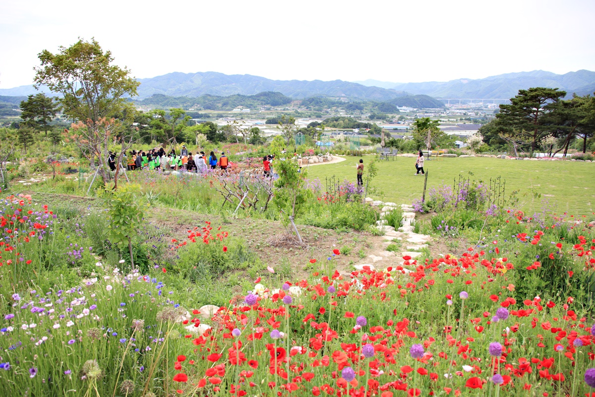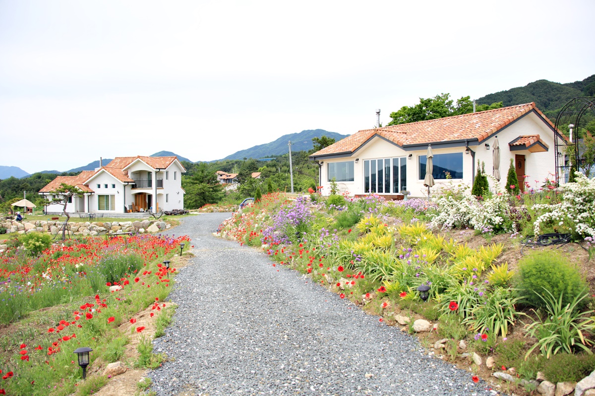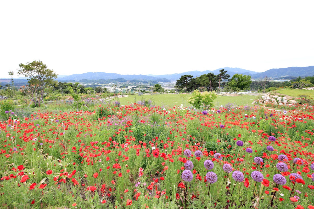 네네 지금 한창입니다. 붉은빛이 강렬한 양귀비를 비롯해 수십 종의 꽃이 천여 평 산상 카페 주변을 뒤덮었습니다. 우리나라에서 네 번째로 높은 산 덕유산 중턱에 자리하고 있습니다.