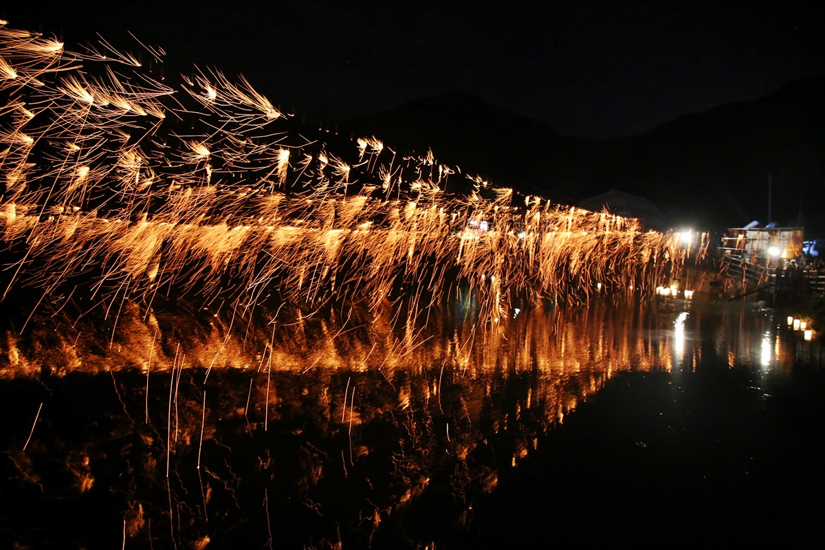 한지로 싼 뽕나무 숯과 말린 쑥, 소금 뭉치를 긴 줄에 매달고 불을 붙이면 줄을 타고 들어가는 불꽃이 장관을 이룹니다. 이날 행사에 사용한 낙화봉은 마을 주민들이 열흘 동안 만든 3,600개 이상 사용되었습니다. 소금이 들어 간 한지 뭉치가 타들어갈 때 나는 소리와 바람에 날리는 숯가루 불꽃이 물 위로 날리며 절정에 달합니다.