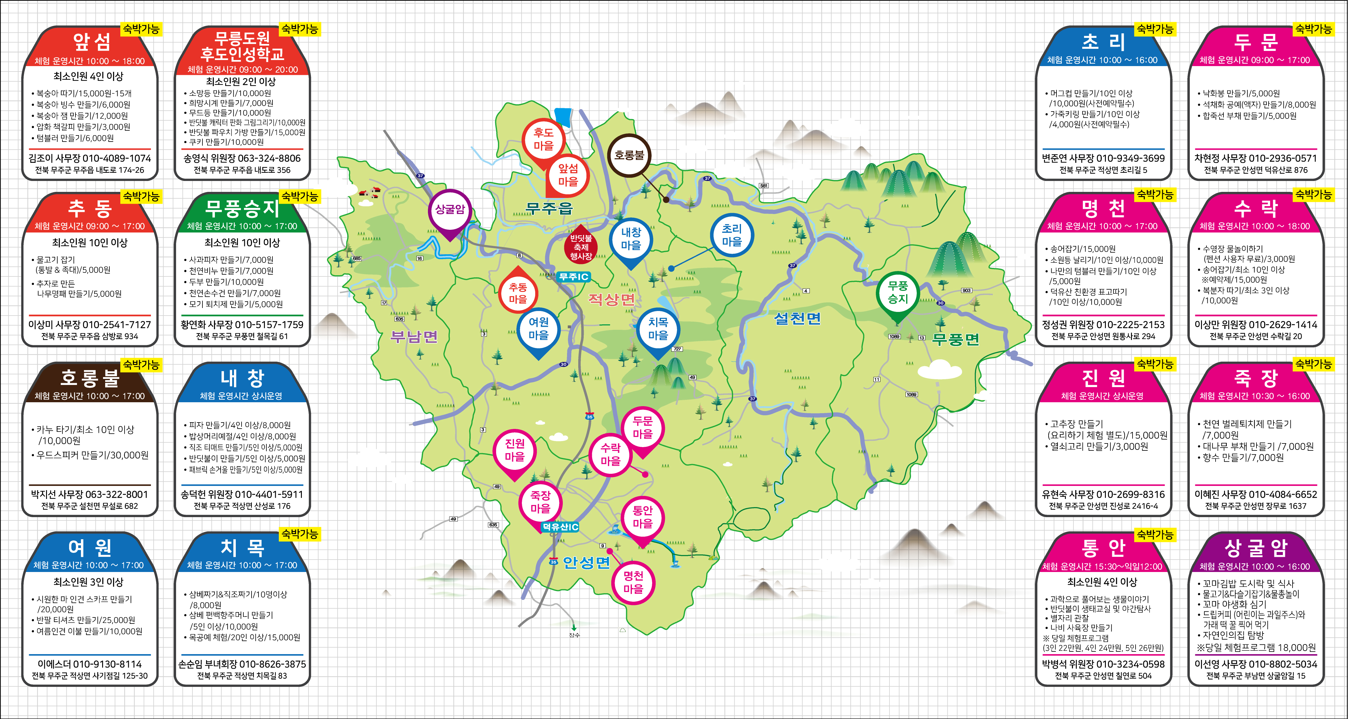 1. 무주 반딧불축제 기간(08월 31일부터 09월 08일까지) 무주군 16개 마을에서 다양한 체험 프로그램을 운영 중입니다. 숙박이 가능한 마을도 있고, 잠시 들러 풍요로움 가득한 마을 마을길을 거닐어도 좋겠지요.