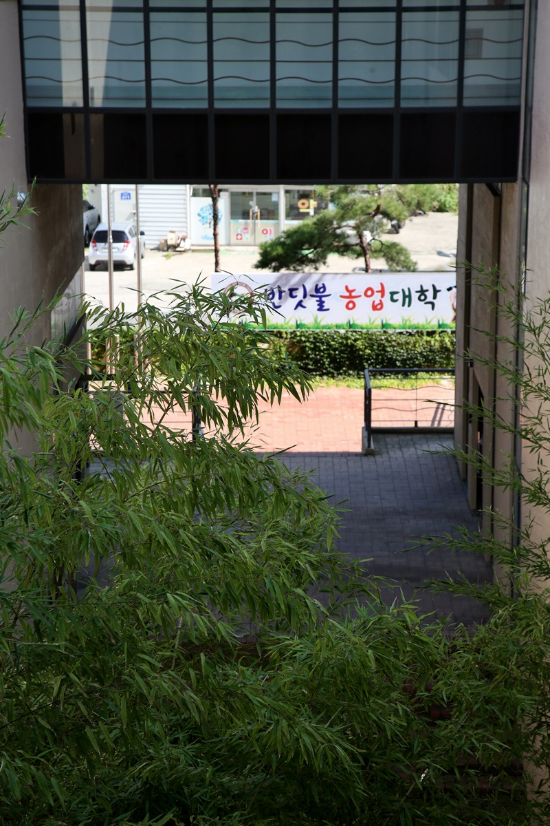 무주읍 동쪽, 보건의료원 맞은편에 독특한 건물 한 채가 있다. 대도시에나 어울릴 법한 건물에는 ‘무주 농민의 집’이라는 큼지막한 표지판까지 걸려 있어 사람들의 호기심을 자극하고 있다. 무주 농민의 집은 농민들의 정보교류와 휴식을 위한 공간으로 지난 2003년 문을 열었다. 무주읍 당산리 도로변에서는 보이지 않지만 농민의 집 뒤편으로는 농업기술센터가 자리 잡고 있다. 이는 계단식 경사진 언덕에 건축하다 보니 앞의 건물이 수직으로 우뚝 솟으면서 뒷건물을 가린 것. 협소한 대지에 숨은 듯 들어선 건물들의 공간 구성이 매우 뛰어나다.