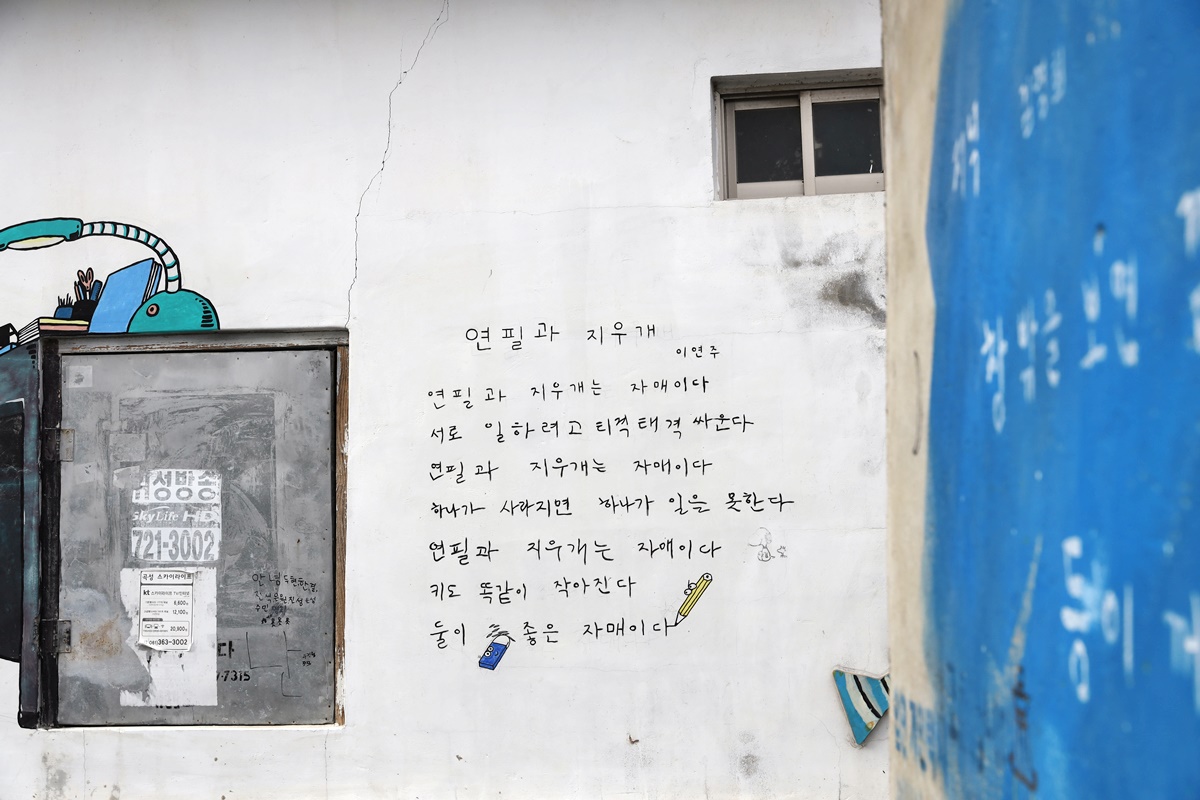 이어서 마을 아이들의 시와 그림을 엮어 ‘혼자 먹는 메론빵’도 펴냈다. 아이들의 글과 그림, 어르신들의 시는 마을 담장에 옮겨 놓았다. 골목을 걷다 보면 마을 아이들의 동심과 어르신들의 인생을 고스란히 느낄 수 있다.