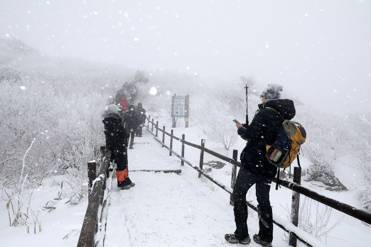 설천봉에서 향적봉(1,614m)까지는 600m로 20~30분 소요된다. 바로 이 구간이 눈꽃트레킹의 백미다. 나무덱을 따라 몇 계단을 오르자마자 눈꽃 터널이 펼쳐진다. 너도나도 스마트폰을 꺼내 들고 눈꽃의 향연을 즐긴다. 쏟아지는 눈에 형형색색의 등산복을 입은 사람들도 어느새 눈사람이 되었다.