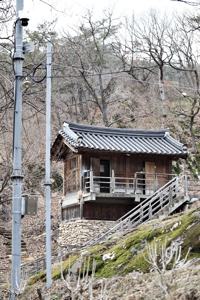 화암사 가는 길은 특별하다. 국도를 벗어나서 화암사 들머리까지 가는 동안 겨우 차 한 대 정도만 다닐 수 있을 정도로 좁은 농로가 이어진다. 주차장에서 절집까지는 약 700미터. 20분이면 충분한 거리지만 보통은 그 두 배의 시간이 걸린다. 계곡을 가운데 두고 시작하는 산책로와 본래 있던 진입로 모두 빠르게 지나치기에는 아까울 만큼 예쁜 길이다. 숲과 계곡을 가로지르며 오르다보면 마지막 철제 계단을 고비로 화암사에 당도한다. 계단 아래로는 2단 폭포가 시원스럽게 흐른다.