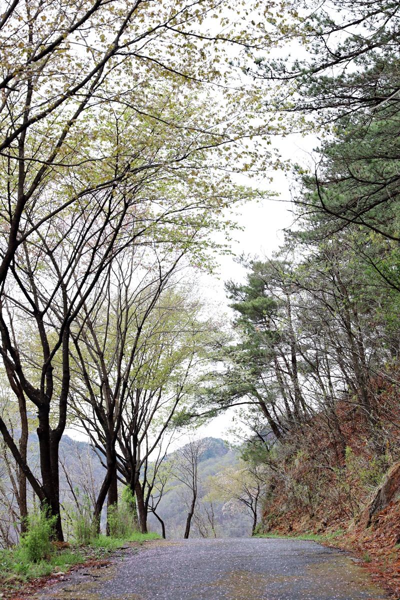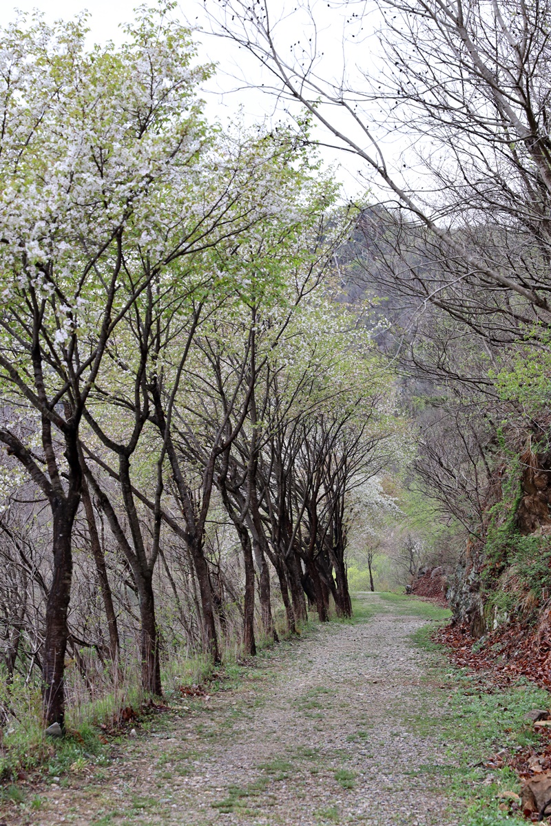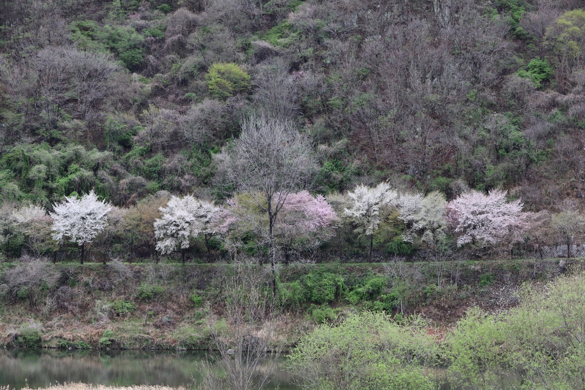 비 그친 아침 금강에 꽃물이 흐른다. 금강변 마실길이 지나는 잠두마을 옛길에는 벚꽃과 조팝꽃, 산복숭아꽃이 어우러지고 산벚꽃까지 만발했다.