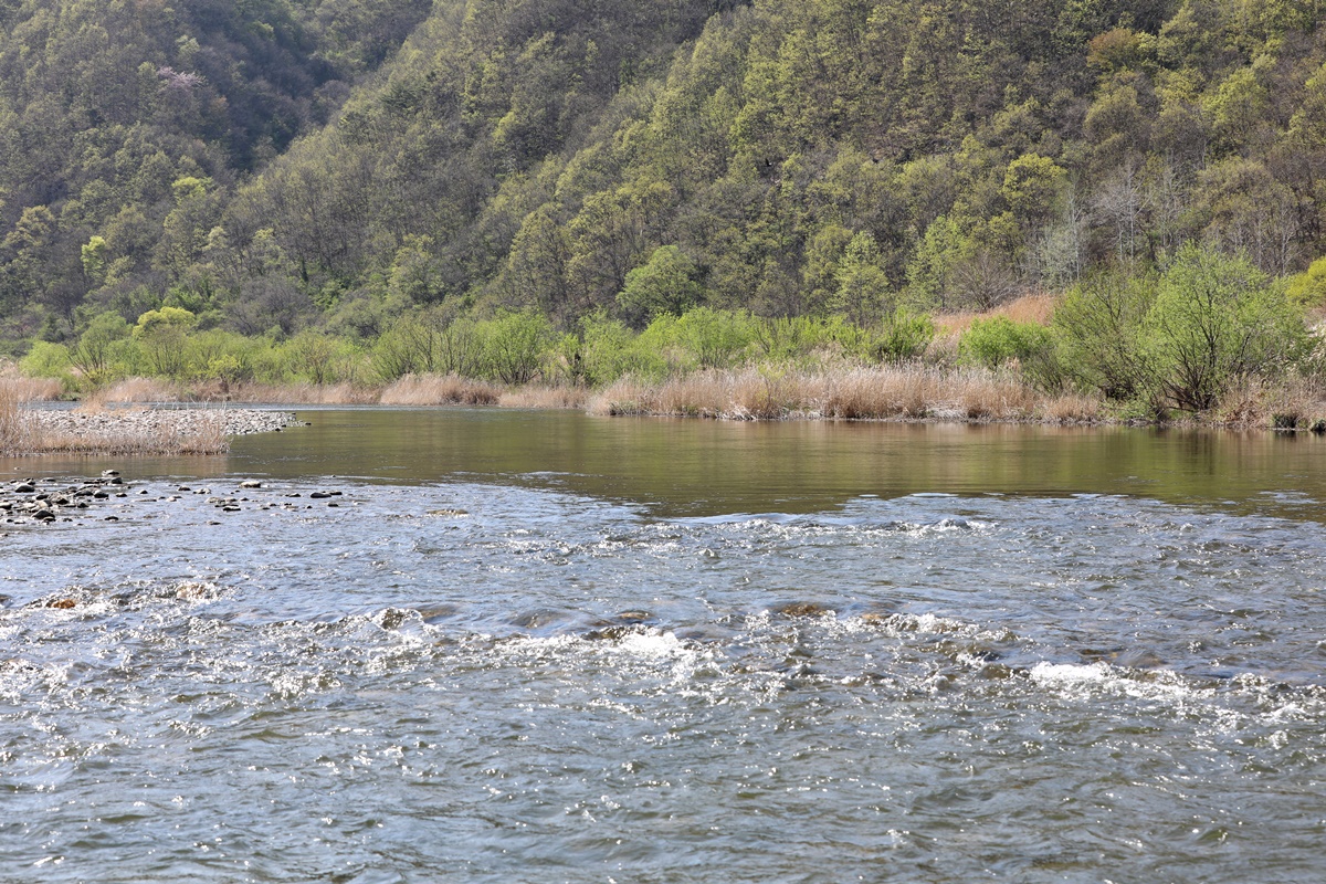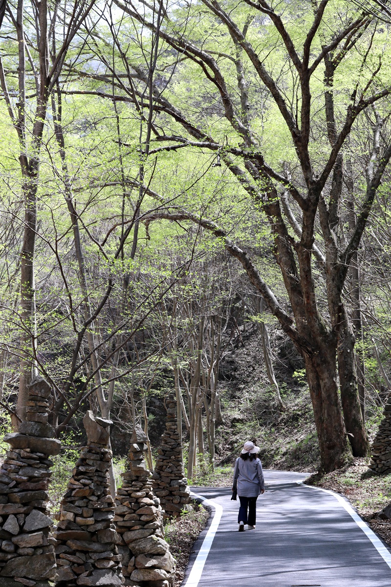 다음으로 찾은 곳은 상굴암마을 용가마골이다. 꼭꼭 숨겨져 있던 용가마골이 세상에 알려진 것은 자연인을 소개하는 TV 프로그램 때문이다. 상굴암마을 송쌍섭 이장 한 가구만 사는 용가마골은 상굴암마을 건너편 상굴교 다리 아래가 들목이다. 강변으로 난 콘크리트 포장도로를 따라가면 이내 숲길로 들어선다. 계곡을 따라 길이 이어진다. 골짜기는 산과 산 사이에 빨랫줄을 걸어도 될 만큼 좁다. 입구부터 연둣빛이 눈부시다. 유심히 보면 현호색, 피나물 같은 키 작은 야생화가 무더기로 피어 있다. 송 이장이 잡풀과 잡목을 제거해서 여느 공원길처럼 깔끔하다.