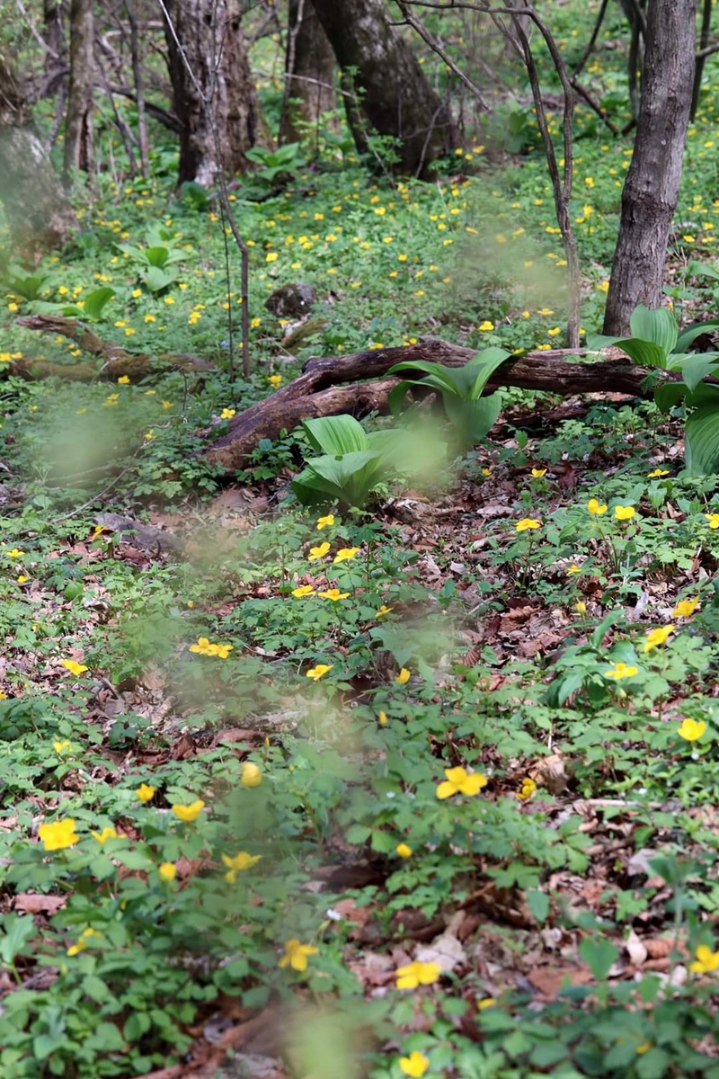 5월에 들어서면 적상산의 주인은 피나물이다. 거대한 군락지에 노란 꽃이 무더기로 피어난다. 산 능선은 아직 연둣빛이라 피나물은 더 빛이 난다.