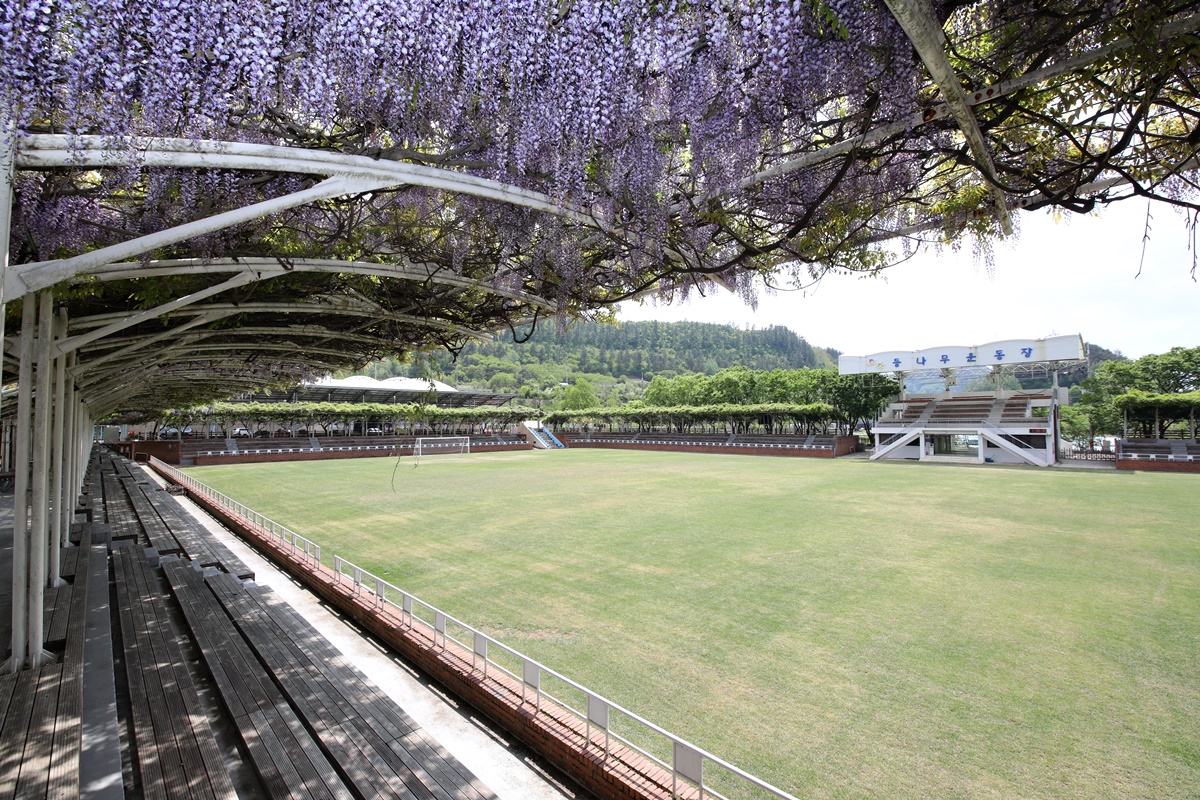봄빛이 무르익었다. 연둣빛은 어느새 초록빛이 되었다. 이즈음이면 기자는 등나무운동장을 생각한다. 올해도 어김없이 등나무운동장을 찾았다. 아침에도 가고 저녁 무렵에도 갔다. 열다섯 해째다. 관중석을 빙 둘러 지붕을 덮은 등꽃이 핀 풍경을 보기 위해서다. 기자는 감히 이 풍경을 무주 제1경이라 꼽는다. 지난 15년 동안 평균적으로 등꽃이 만개한 시기는 5월 5일을 전후해서다. 올해도 역시 빗나가지 않았다. 5월 5일 어린이날 등나무운동장에는 보라색 등꽃이 활짝 피었다.