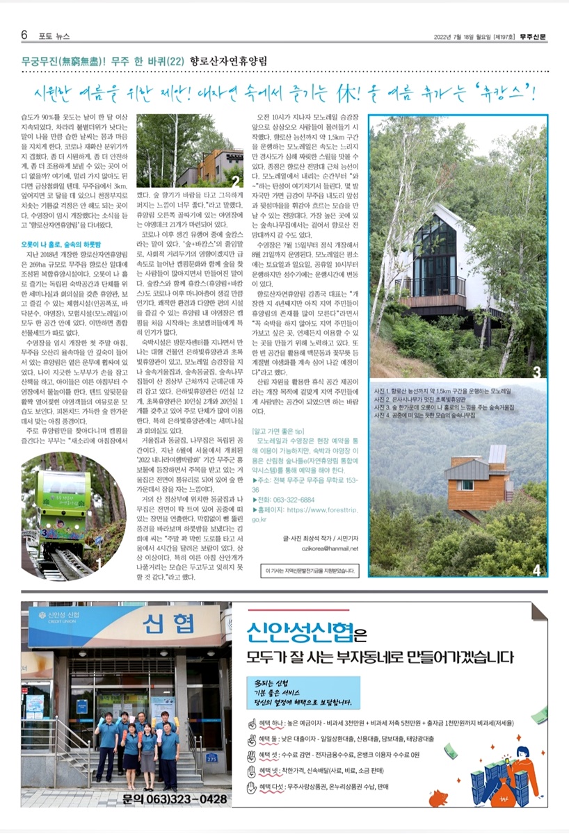 수영장을 임시 개장한 첫 주말 아침, 무주읍 오산리 율속마을 안 깊숙이 들어 서 있는 휴양림은 옅은 운무에 휩싸여 있었다. 나이 지긋한 노부부가 손을 잡고 산책을 하고, 아이들은 이른 아침부터 수영장에서 물놀이를 한다. 텐트 앞뒷문을 활짝 열어젖힌 야영객들의 여유로운 모습도 보인다. 피톤치드 가득한 숲 한가운데서 맞는 아침 풍경이다.