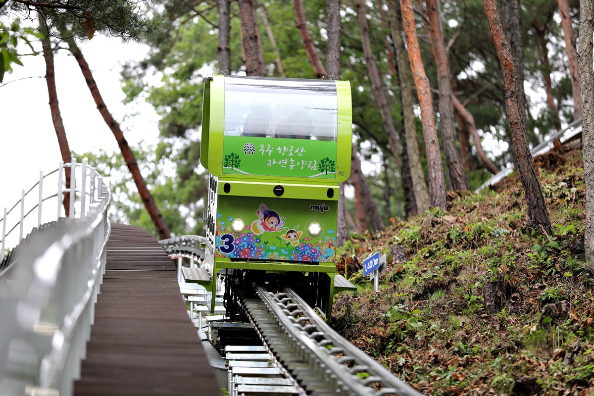 지난 2018년 개장한 향로산자연휴양림은 269ha 규모로 무주읍 향로산 일대에 조성된 복합휴양시설이다. 오롯이 나 홀로 즐기는 독립된 숙박공간과 단체를 위한 세미나시설과 회의실을 갖춘 휴양관, 보고 즐길 수 있는 체험시설(인공폭포, 바닥분수, 야영장), 모험시설(모노레일)이 모두 한 공간 안에 있다. 이만하면 종합선물세트가 따로 없다.