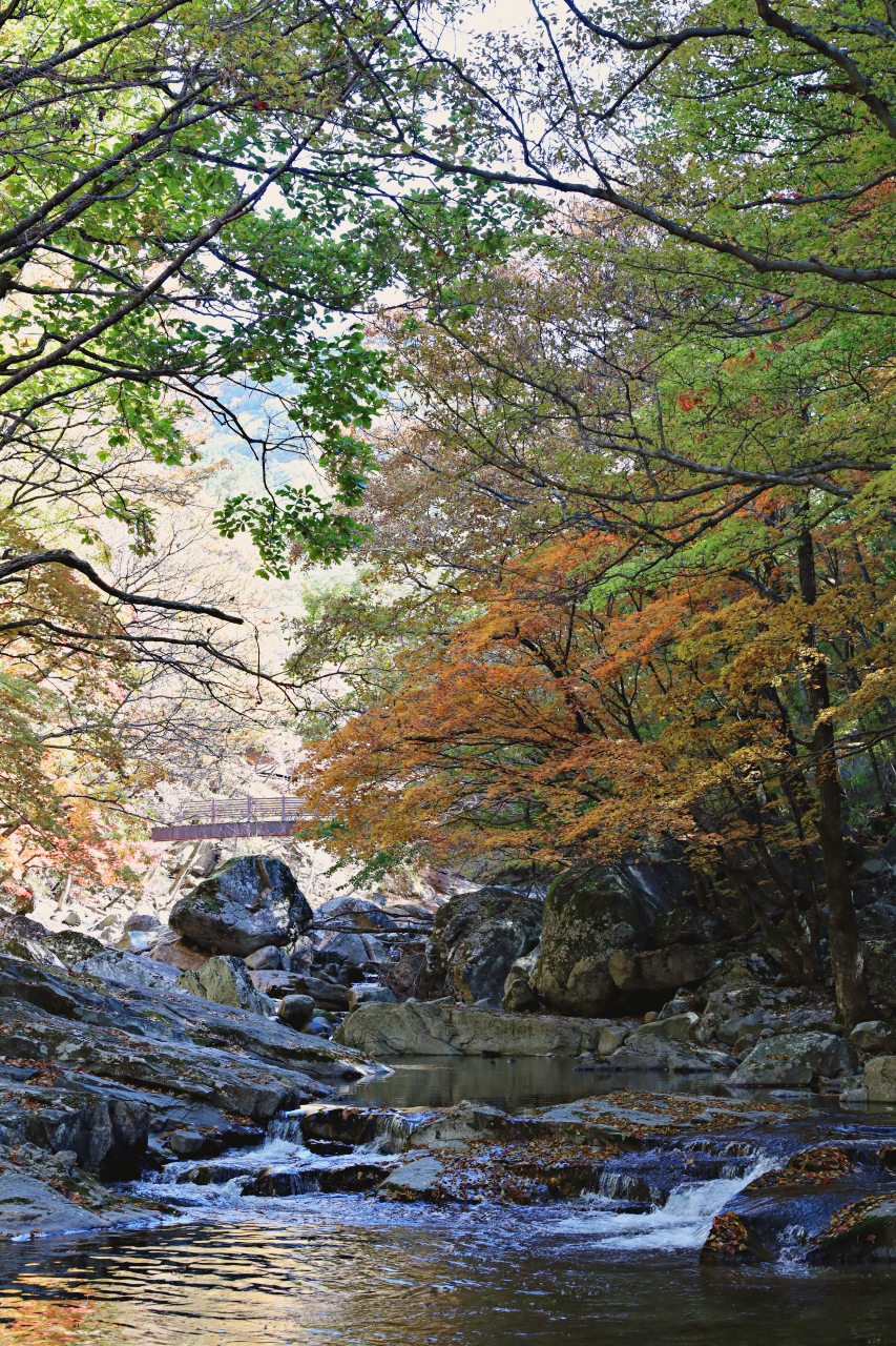 올 가을 무주구천동 계곡의 단풍은 예년에 비해 더 곱고 화려하다. 기온이 뚝 떨어지면서 며칠 사이 가을빛이 깊게 물들었다. 사진은 어사길 2구간 청류대와 비파담 일대 오늘 모습으로 단풍은 이번 주말쯤이 가장 좋을 것 같다.