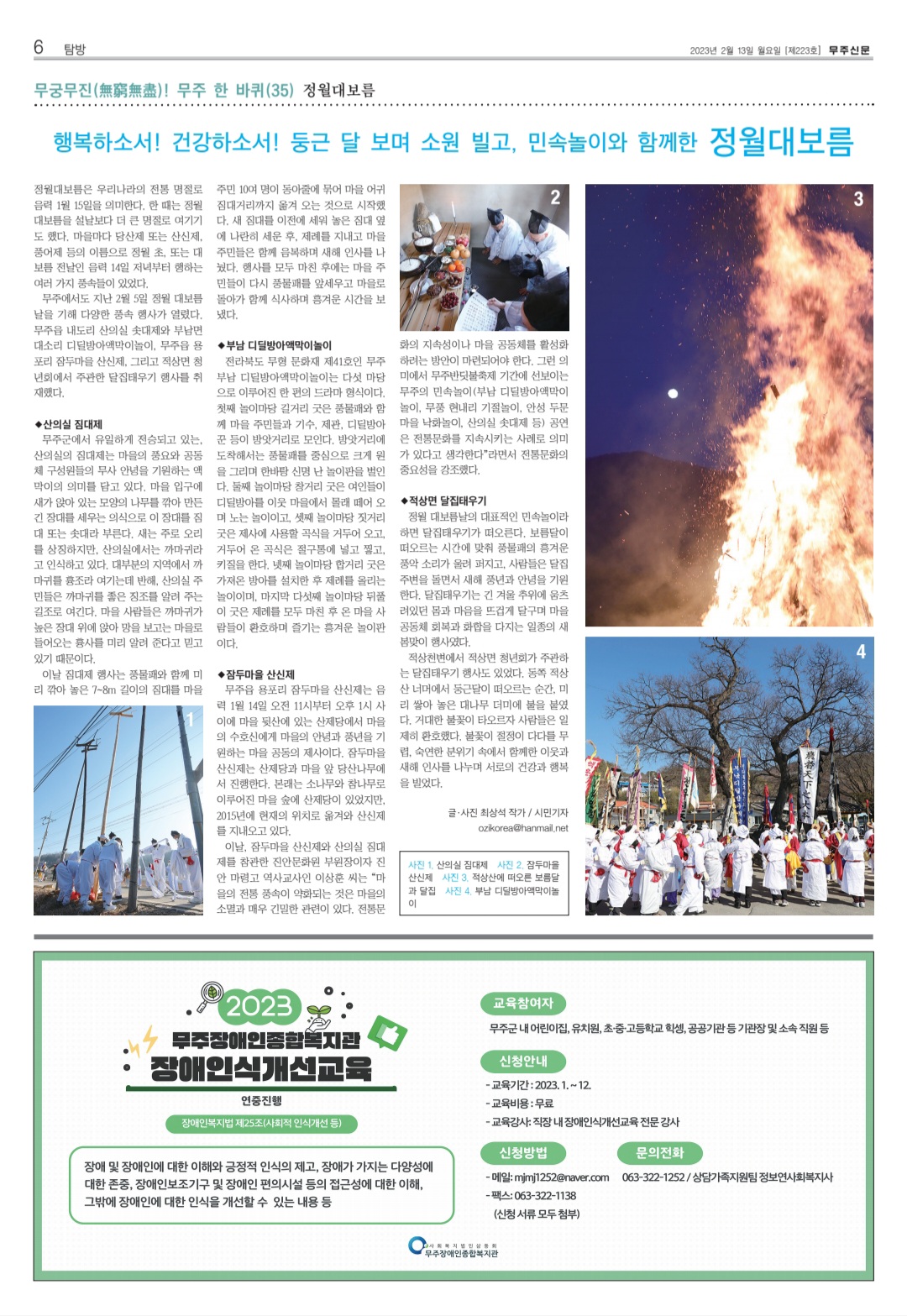 무주에서도 지난 2월 5일 정월 대보름날을 기해 다양한 풍속 행사가 열렸다. 무주읍 내도리 산의실 솟대제와 부남면 대소리 디딜방아액막이놀이, 무주읍 용포리 잠두마을 산신제, 그리고 적상면 청년회에서 주관한 달집태우기 행사를 취재했다.