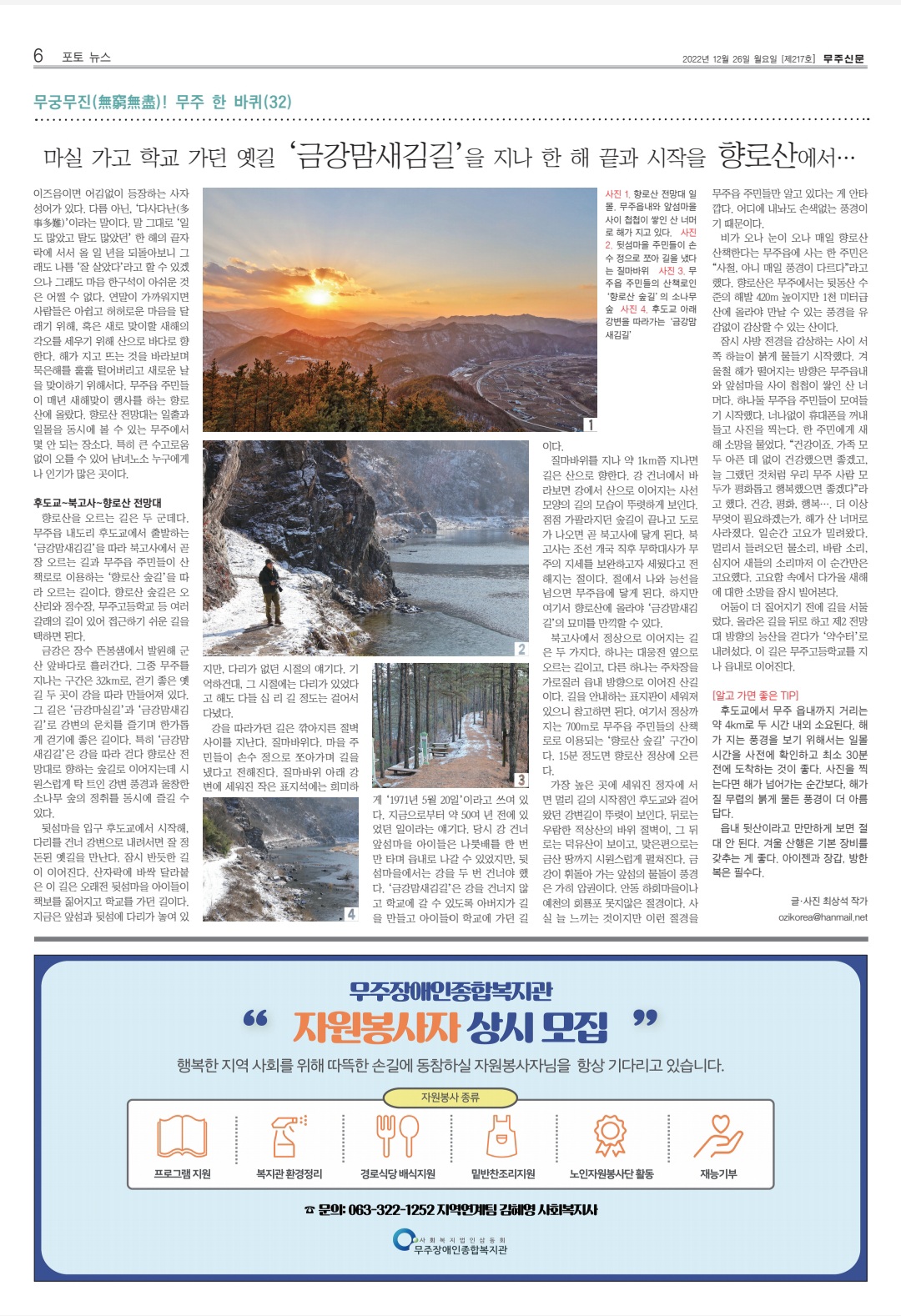 이즈음이면 어김없이 등장하는 사자성어가 있다. 다름 아닌, ‘다사다난(多事多難)’이라는 말이다. 말 그대로 ‘일도 많았고 탈도 많았던’ 한 해의 끝자락에 서서 올 일 년을 되돌아보니 그래도 나름 ‘잘 살았다’라고 할 수 있겠으나 그래도 마음 한구석이 아쉬운 것은 어쩔 수 없다. 연말이 가까워지면 사람들은 아쉽고 허허로운 마음을 달래기 위해, 혹은 새로 맞이할 새해의 각오를 세우기 위해 산으로 바다로 향한다. 해가 지고 뜨는 것을 바라보며 묵은해를 훌훌 털어버리고 새로운 날을 맞이하기 위해서다. 무주읍 주민들이 매년 새해맞이 행사를 하는 향로산에 올랐다. 향로산 전망대는 일출과 일몰을 동시에 볼 수 있는 무주에서 몇 안 되는 장소다. 특히 큰 수고로움 없이 오를 수 있어 남녀노소 누구에게나 인기가 많은 곳이다.