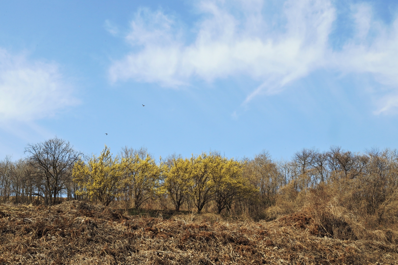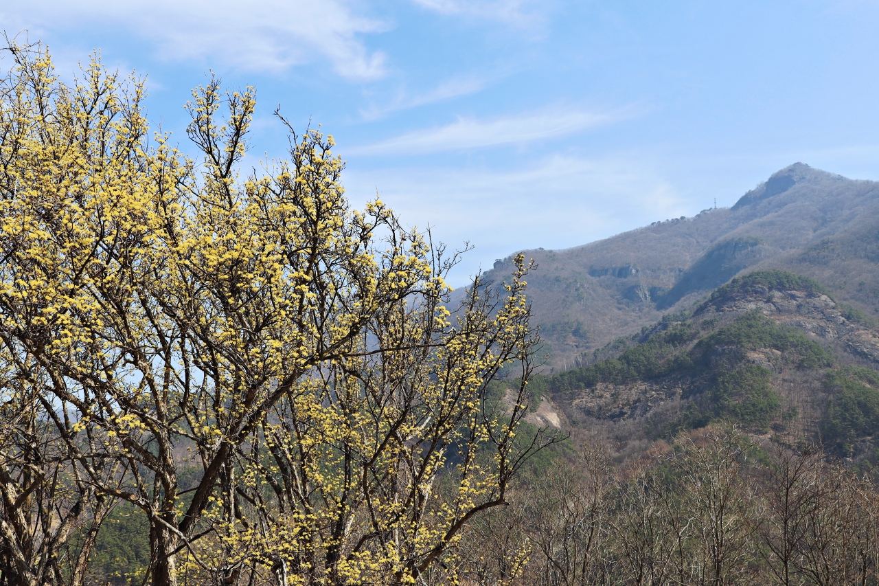 적상산이 한눈에 바라다보이는 ‘밀모 언덕’에 산수유꽃이 활짝 폈다. ‘빨강치마 리조트’가 있는 밀모 언덕에 오르면 맞은편 적상산의 파노라마가 코앞에 펼쳐진다.