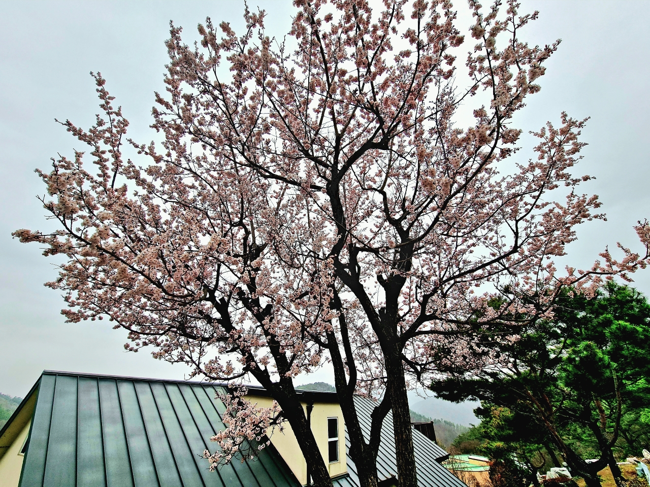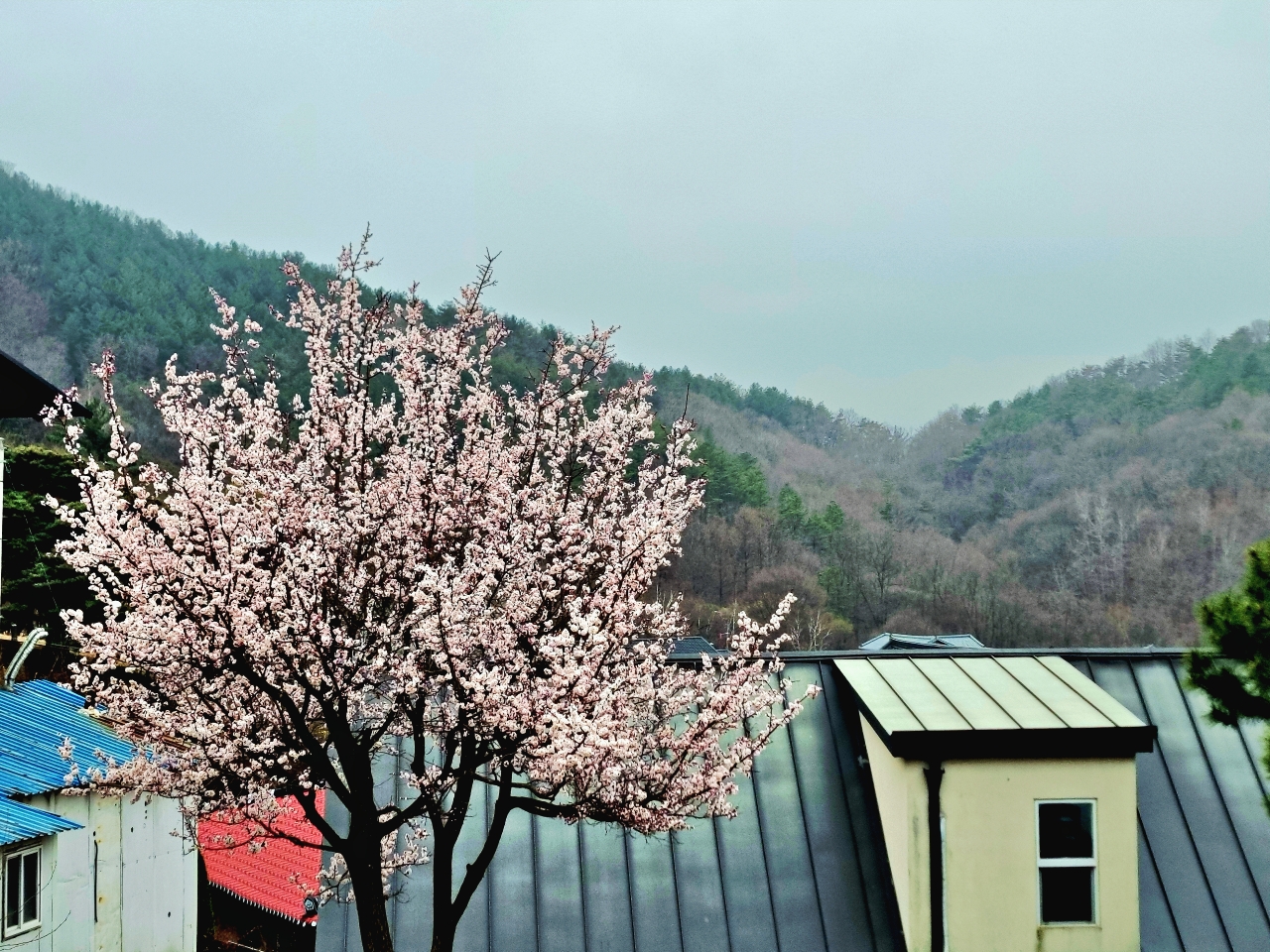 문득, 고개를 들어 하늘을 보니, 살구꽃이 폈네.