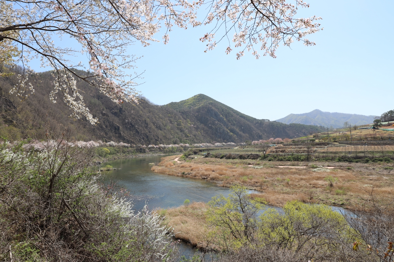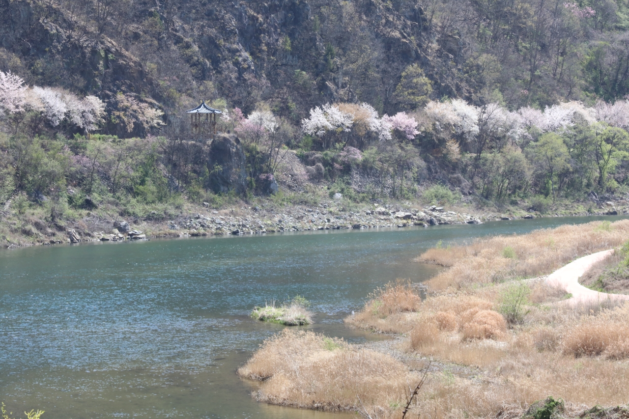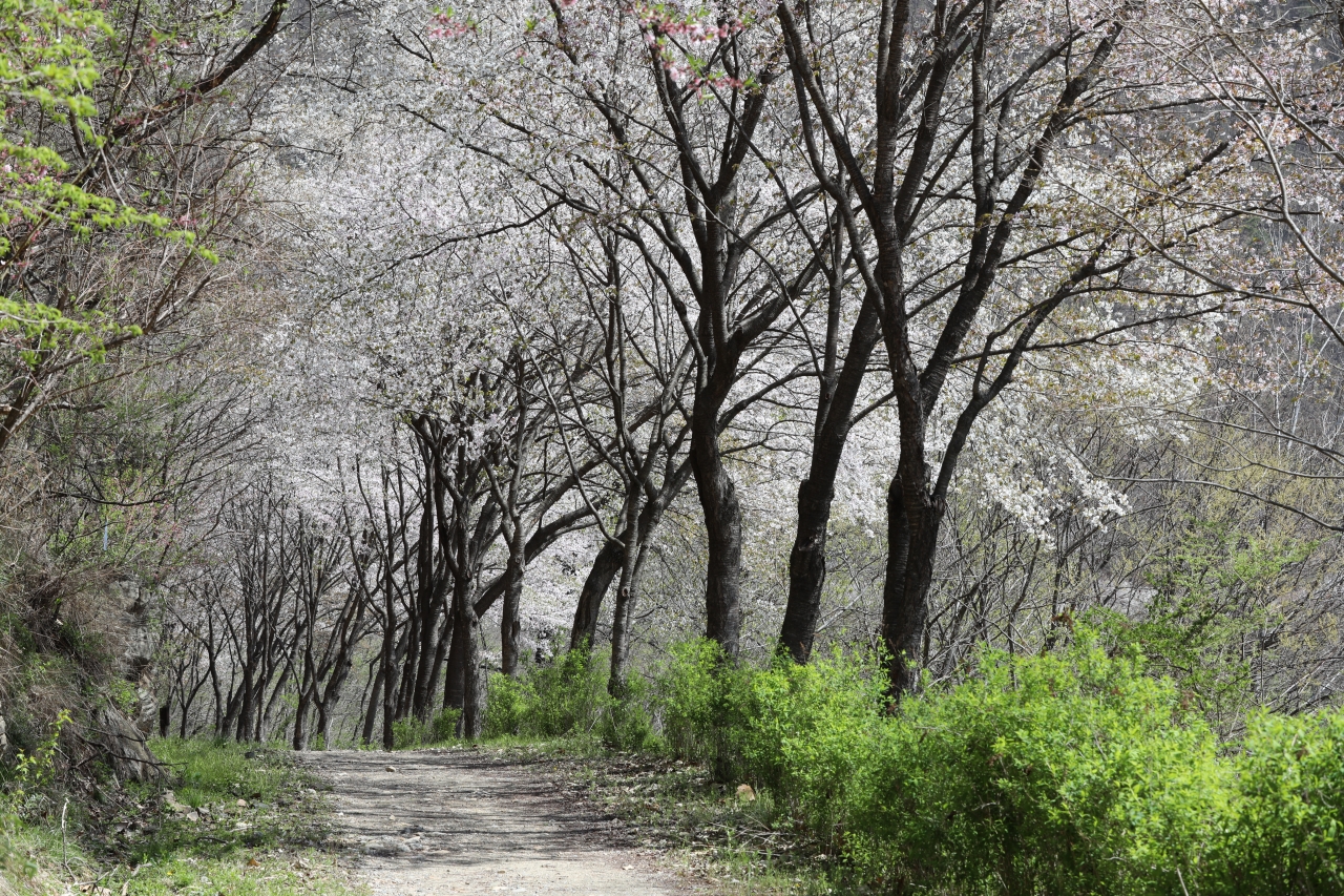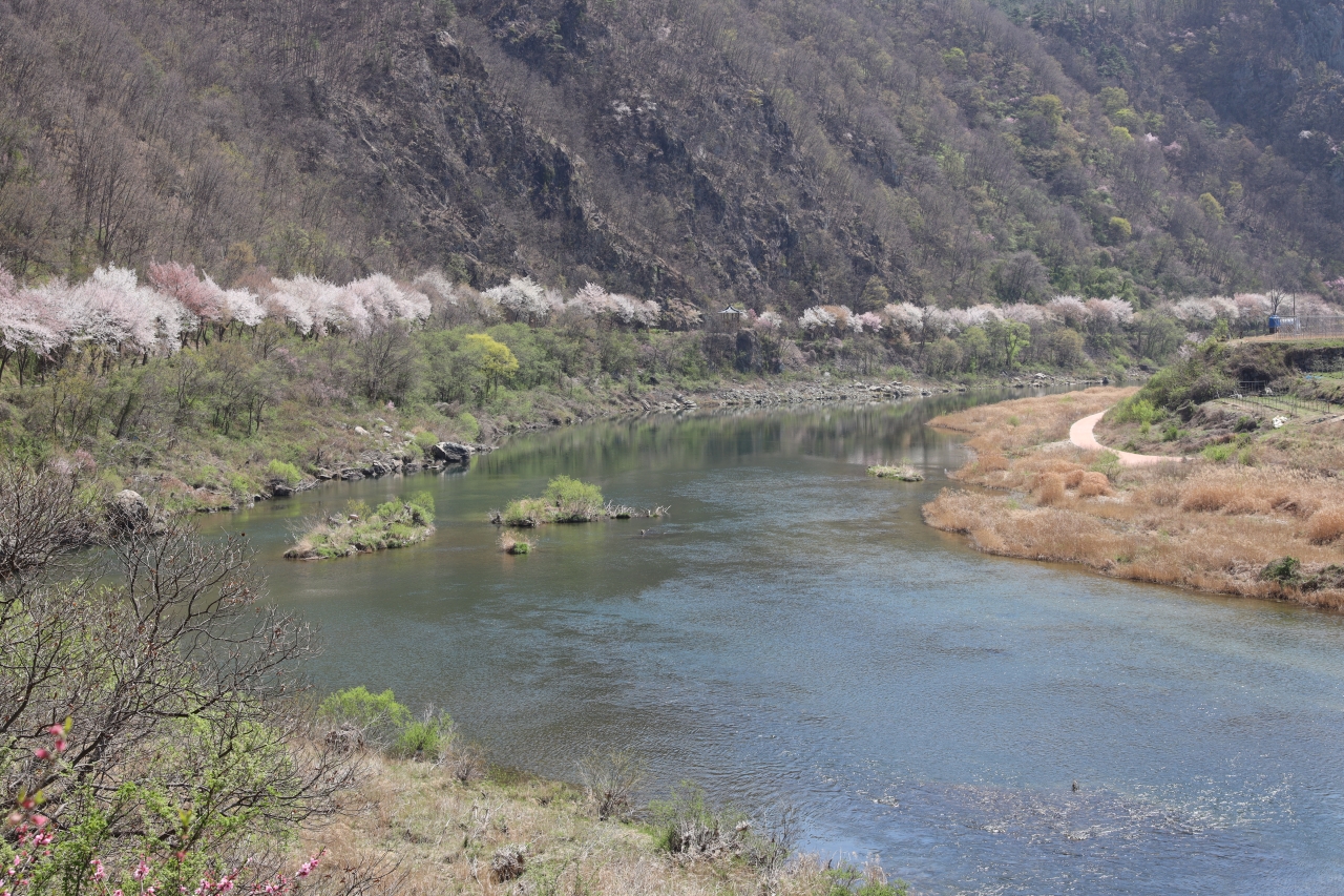 빛이 스며든 옛길은 미지의 세계로 향하는 통로다. 자동차가 다니던 옛길은 두 사람이 손잡기 걷기에 딱 좋을 만큼의 넓이다. 벚나무 가로수가 늘어선 옛길 입구에서 5분쯤 걸어 들어가면 탁 트인 시야와 함께 금강의 물줄기가 한눈에 들어온다. 벚꽃과 산복숭아나무꽃, 조팝나무꽃이 한데 어우러져 금강 최고의 절경을 만들어낸다.